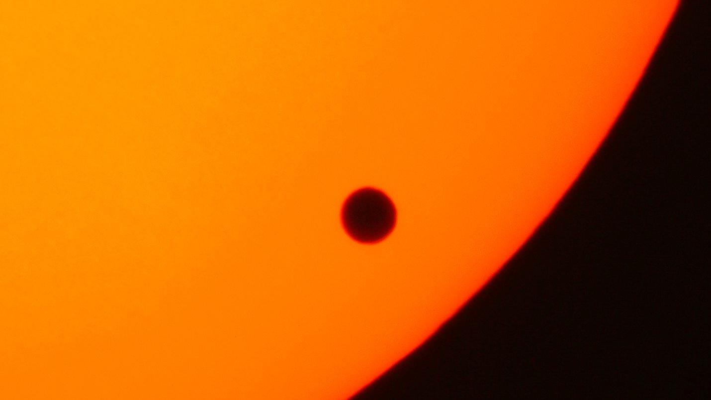 Am 6. Juni 2012 wird die Bahn der Venus zwischen Erde und Sonne verlaufen. Diese Teleskopaufnahme zeigt die "schwarze Venus" nahe dem östlichen Rand der Sonne während ihres Transits am 8. Juni 2004.