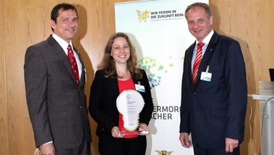Reinhold Gall, baden-württembergischer Innenminister zeichnet Anja Frank als Übermorgenmacherin aus. V.l.n.r.: Philipp von Ritter, Standortleiter DLR-Stuttgart, Anja Frank, DLR-Institut für Raumfahrtantriebe, Reinhold Gall, Innenminister Baden-Württemberg.