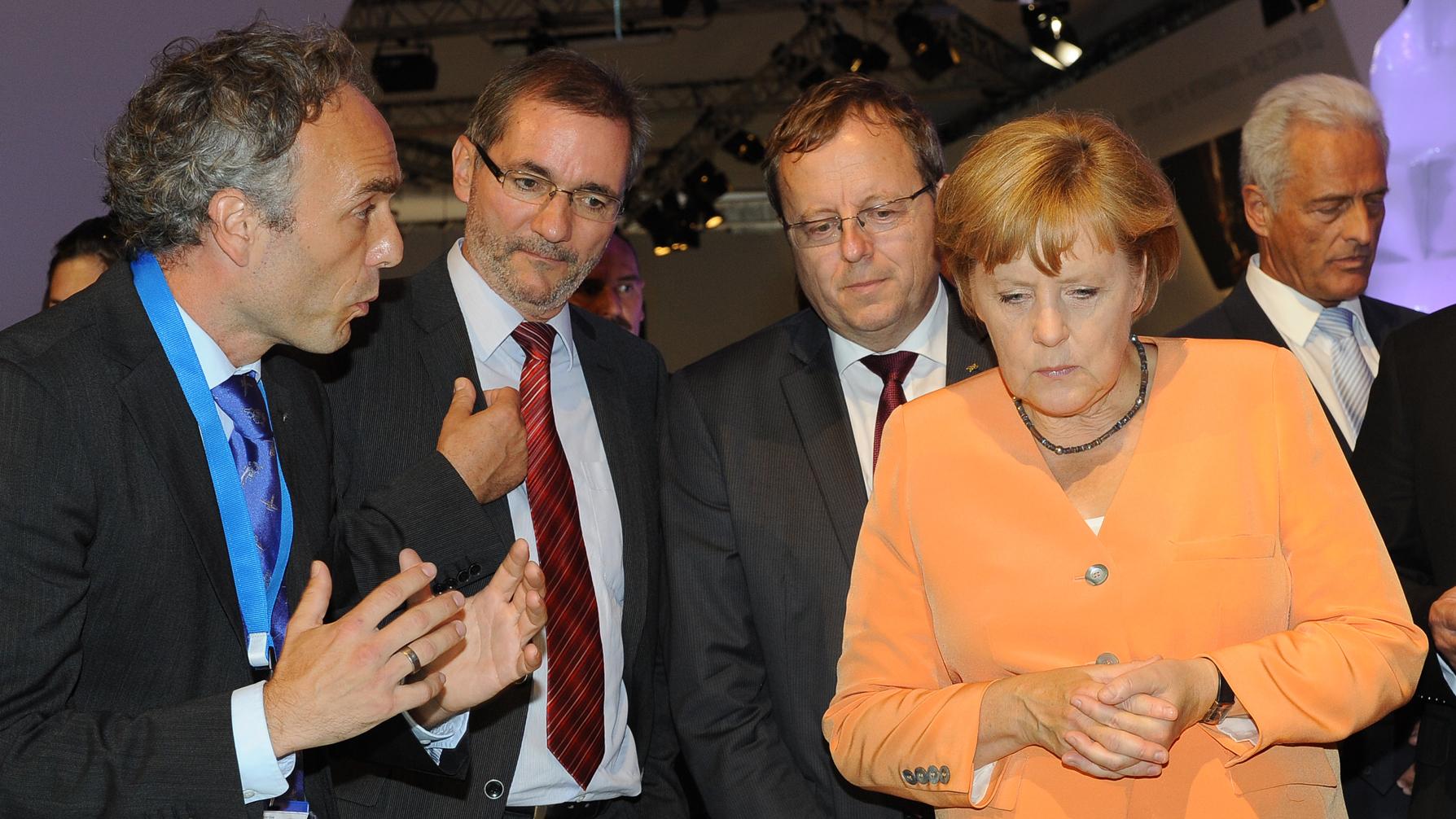 Nils Sparwasser vom DLR beschreibt der Kanzlerin den deutschen Radarsatelliten TerraSAR-X (vlnr: Nils Sparwasser, Mathias Platzeck, Ministerpräsident des Landes Brandenburg, Johann-Dietrich Wörner, Vorstandsvorsitzender des DLR, Bundeskanzlerin Angela Merkel).