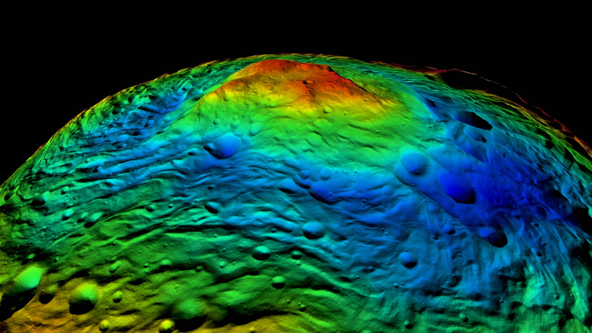 Das Rheasilvia-Einschlagsbecken am Südpol von Vesta: Die perspektivische, in Falschfarben dargestellte Topographie des Südpols von Vesta zeigt in blauen Farbtönen Teile des 500 Kilometer großen Rheasilvia-Einschlagsbeckens sowie im Zentrum der Struktur ein über 20 Kilometer hohes Bergmassiv in grünen, gelben und roten Tönen. Das globale topographische Oberflächenmodell von Vesta wurde von DLR-Wissenschaftlern aus tausenden Einzelbildern durch Stereo-Photogrammetrie abgeleitet. Bild: NASA/JPL-Caltech/UCLA/MPS/DLR/IDA.