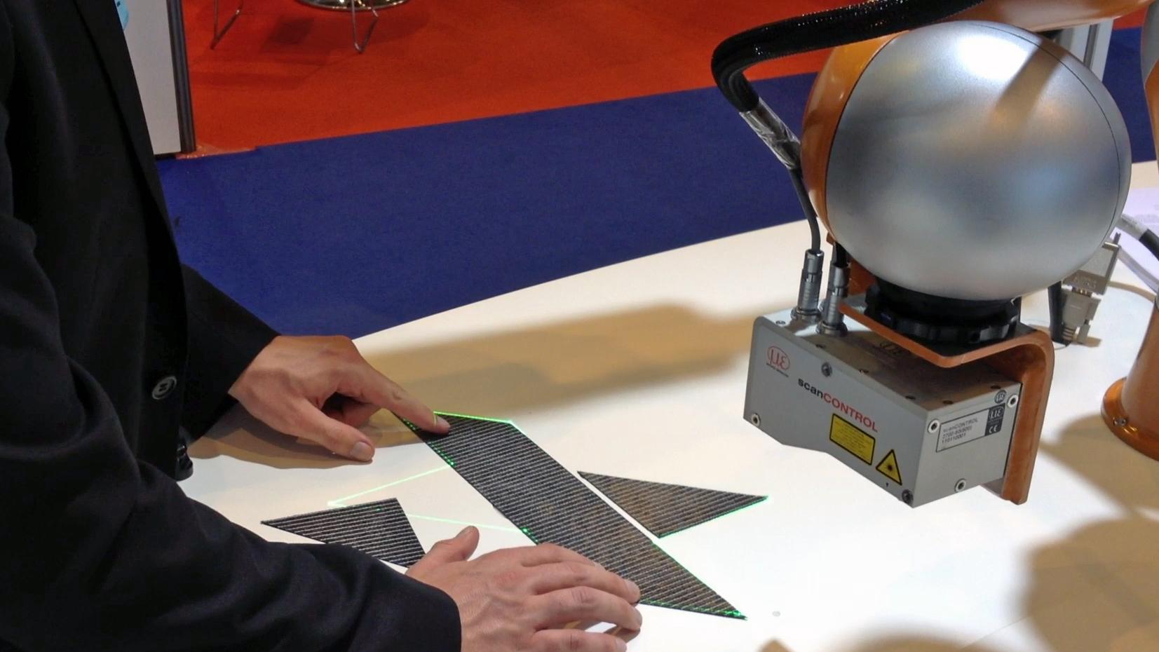 Ein Besucher positioniert Zuschnitte und bewegt anschließend den Roboter in Messposition.
