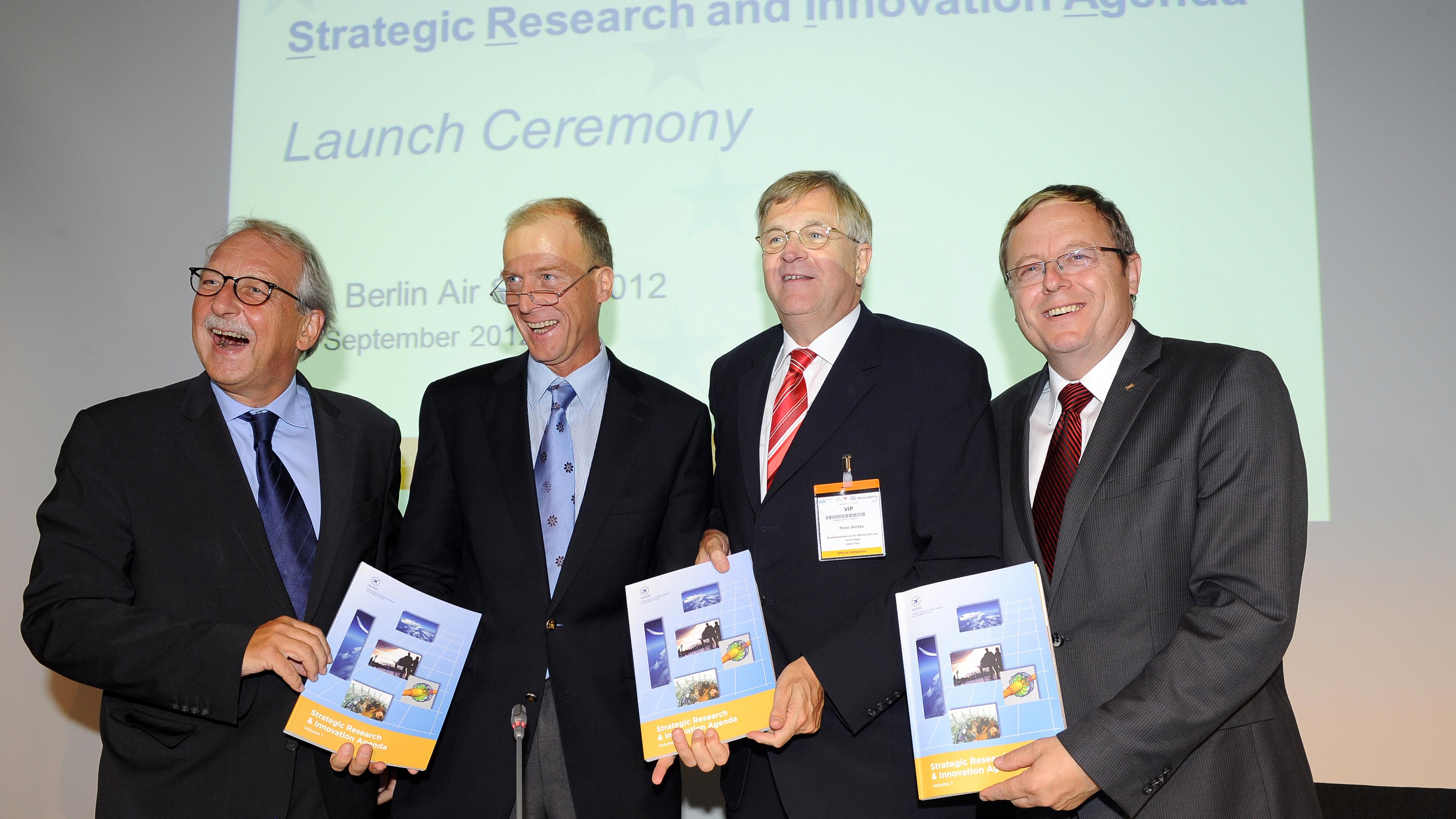 Der Vorsitzende und der Co-Vorsitzende von ACARE, Dr. Thomas Enders (2.v.l.), EADS-Vorstandsvorsitzender, und Prof. Johann-Dietrich Wörner (4.v.l.), DLR-Vorstandsvorsitzender, übergaben die Forschungsagenda an Dr. Matthias Ruete (1.v.l.), Generaldirektor Verkehr der Europäischen Kommission, und an den Luft- und Raumfahrtkoordinator der Bundesregierung , Staatssekretär Peter Hintze (3.v.l.).