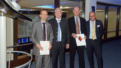 Im Bild (von links nach rechts): Prof. Dr. Felix Huber, Direktor des Raumflugbetriebs des DLR - Martin Zeil, Bayerischer Staatsminister für Wirtschaft, Infrastruktur, Verkehr und Technologie - Dr. Gerd Gruppe, Mitglied des Vorstands des DLR - Ulrich Böger, Regierungsvizepräsident von Oberbayern.