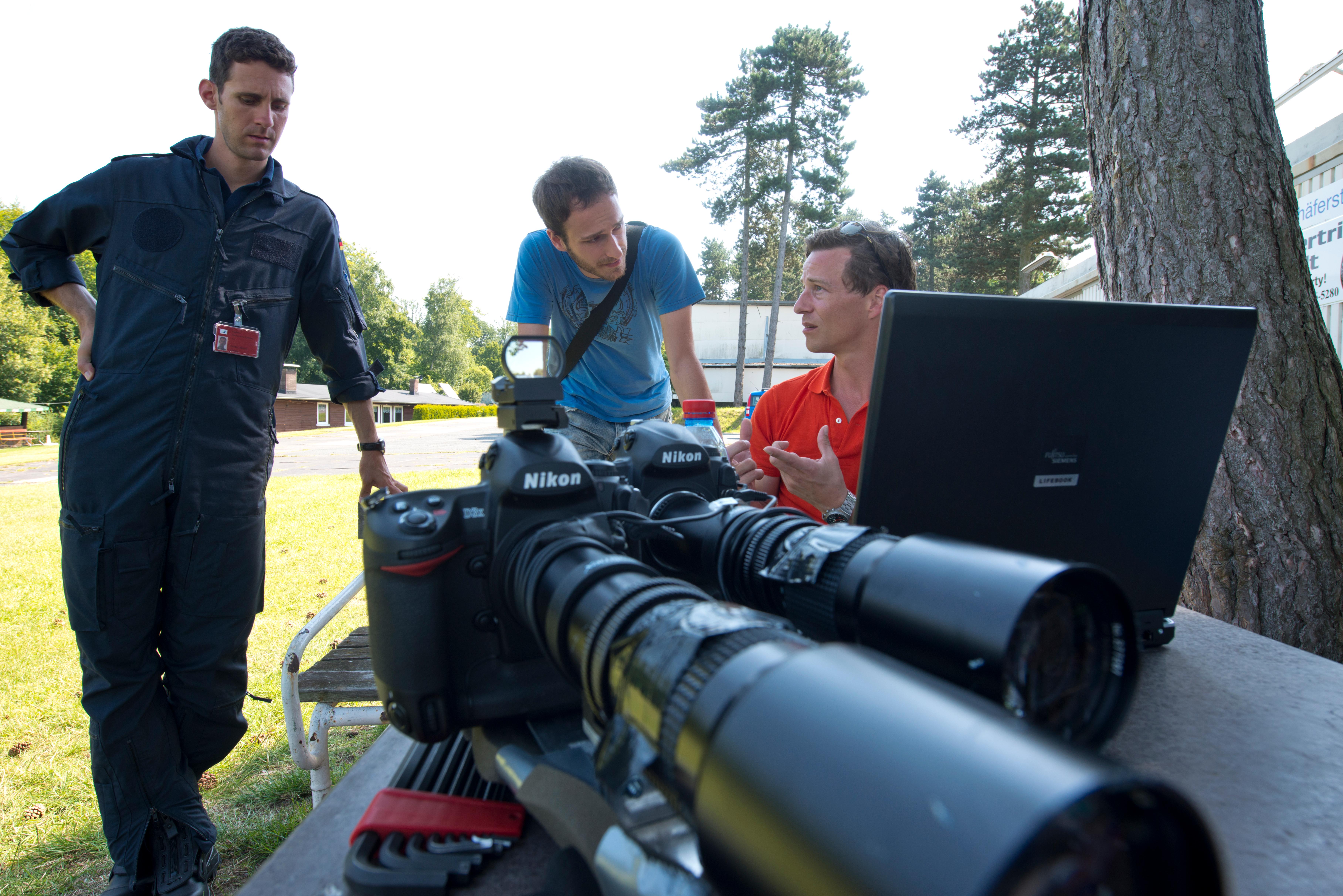Die DLR-Wissenschaftler besprechen den Versuchsablauf. Von links: DLR-Hubschrauberpilot Martin Gerber, Doktorand André Bauknecht und Versuchsleiter Kolja Kindler. Im Vordergrund: die Kamerakonstruktion mit der zeitlich versetzt die Bilder aufgenommen wurden, um die Blattspitzenwirbel sichtbar zu machen.
