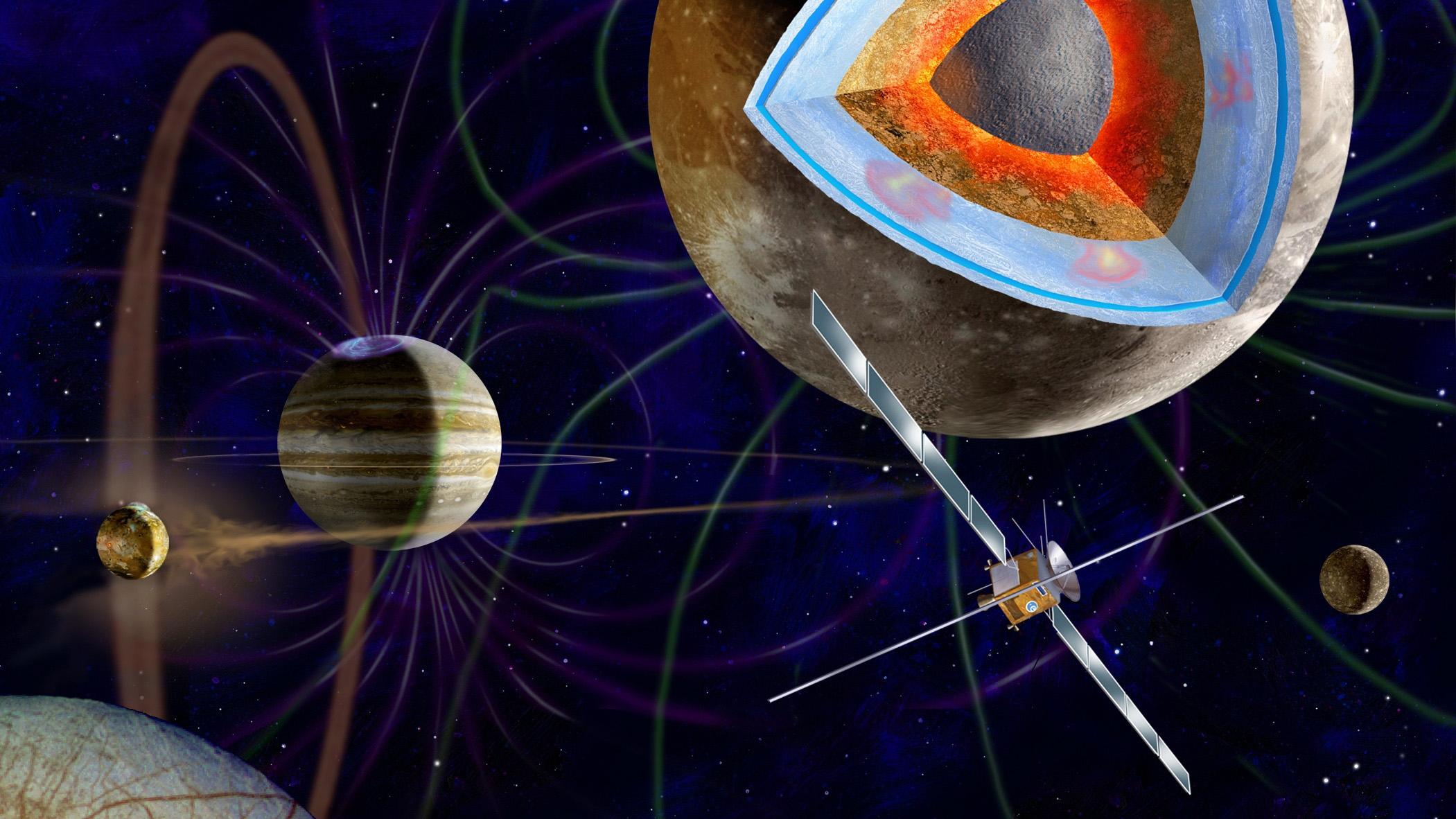 Wasserozean zwischen zwei Eispanzern, die den Kern aus Metall und Gestein umgeben. Der kleine Mond links im Bild ist Io, der keinen Eispanzer hat, dafür aber Schwefel-Geysire aufweist. Io wird von JUICE nicht angeflogen werden.