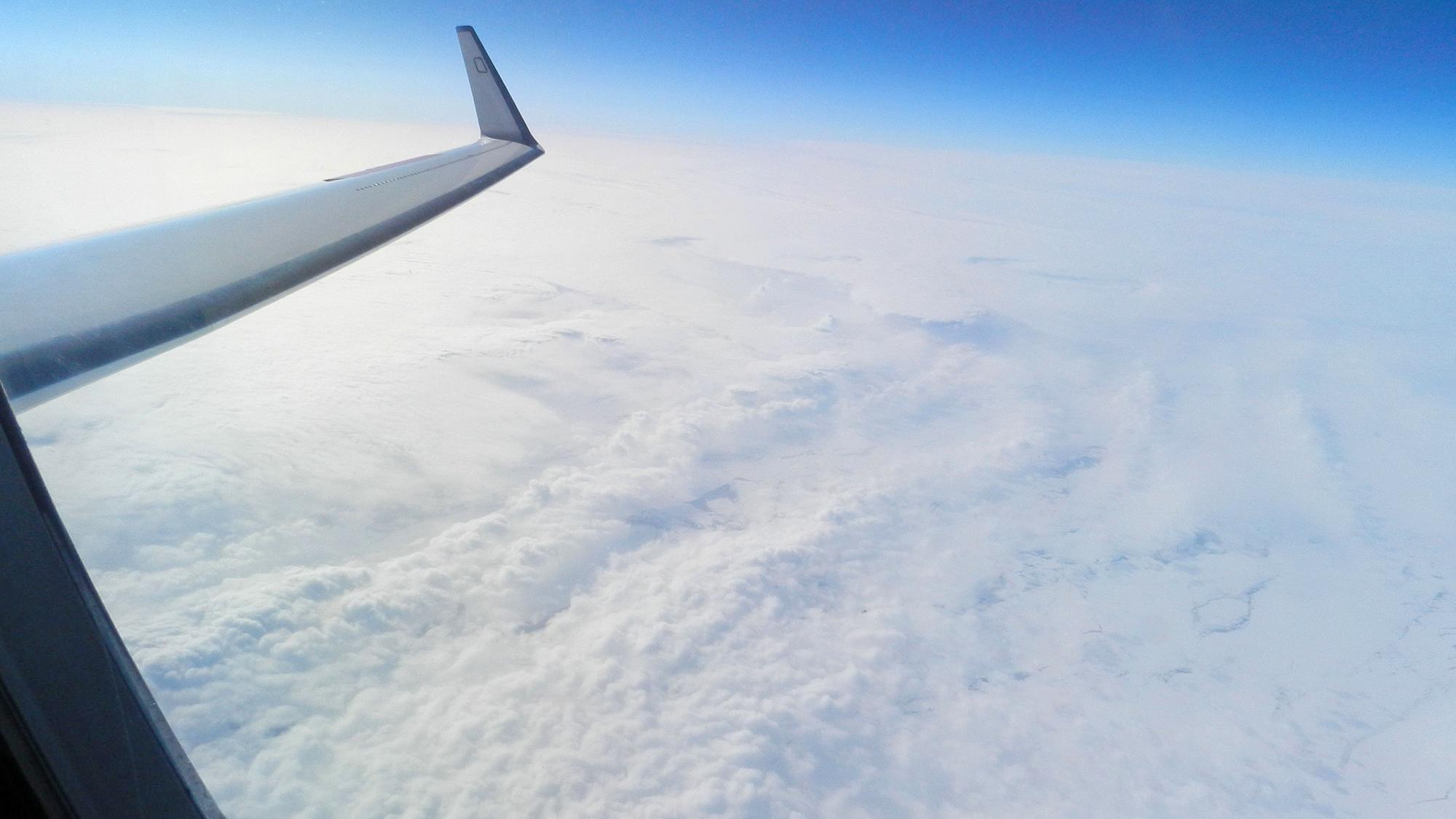 Mit HALO am Rande des antarktischen Kontinents: weiß auf weiß sind Eis- und Wolkenfelder erkennbar.