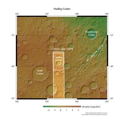 Der Hadley-Krater auf dem Mars wurde im Laufe seiner Geschichte gleich mehrmals von großen Asteroiden getroffen. Die so entstandenen Krater im Krater ermöglichen einen über zwei Kilometer tiefen Einblick in die Marskruste. Die vom DLR betriebene, hochauflösende Stereokamera HRSC auf der europäischen Raumsonde Mars Express fotografierte am 09. April 2012 den Hadley-Krater während Orbit 10.572. Die im Artikel gezeigten Bilder stammen aus dem kleinen Rechteck innerhalb des HRSC-Bildstreifens.