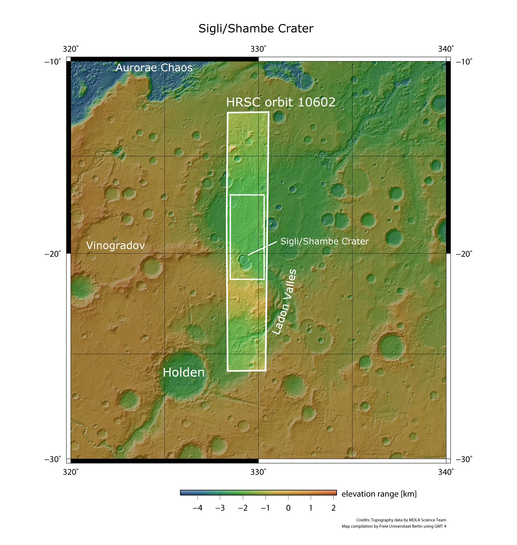 Südlich des Kraters Holden erstreckt sich über mehrere hundert Kilometer ein System aus Tälern und Vertiefungen, das vom südlichen Marshochland in Richtung Norden verläuft. Bereits in der Übersichtskarte ist zu erkennen, dass Wasser durch Täler wie Ladon Valles strömte, die in ein großes, altes, schon stark erodiertes Einschlagsbecken mündeten. Die vom DLR betriebene, hochauflösende Stereokamera HRSC auf der europäischen Raumsonde Mars Express fotografierte am 27. April 2012 die nördlichen Ausläufer von Ladon Valles und den Doppelkrater Sigli/Shambe während Orbit 10.602 aus etwa 480 Kilometern Höhe. Die hier gezeigten Szenen stammen aus dem kleinen Rechteck innerhalb des HRSC-Bildstreifens.