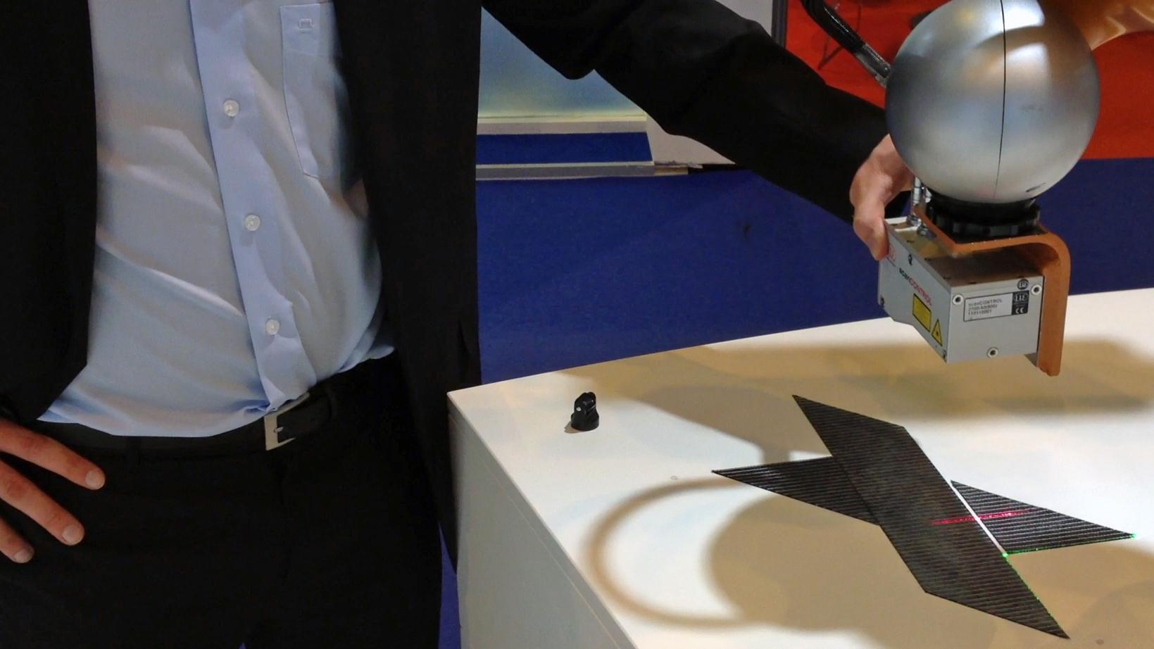 Ein Besucher positioniert Zuschnitte und bewegt anschließend den Roboter in Messposition.