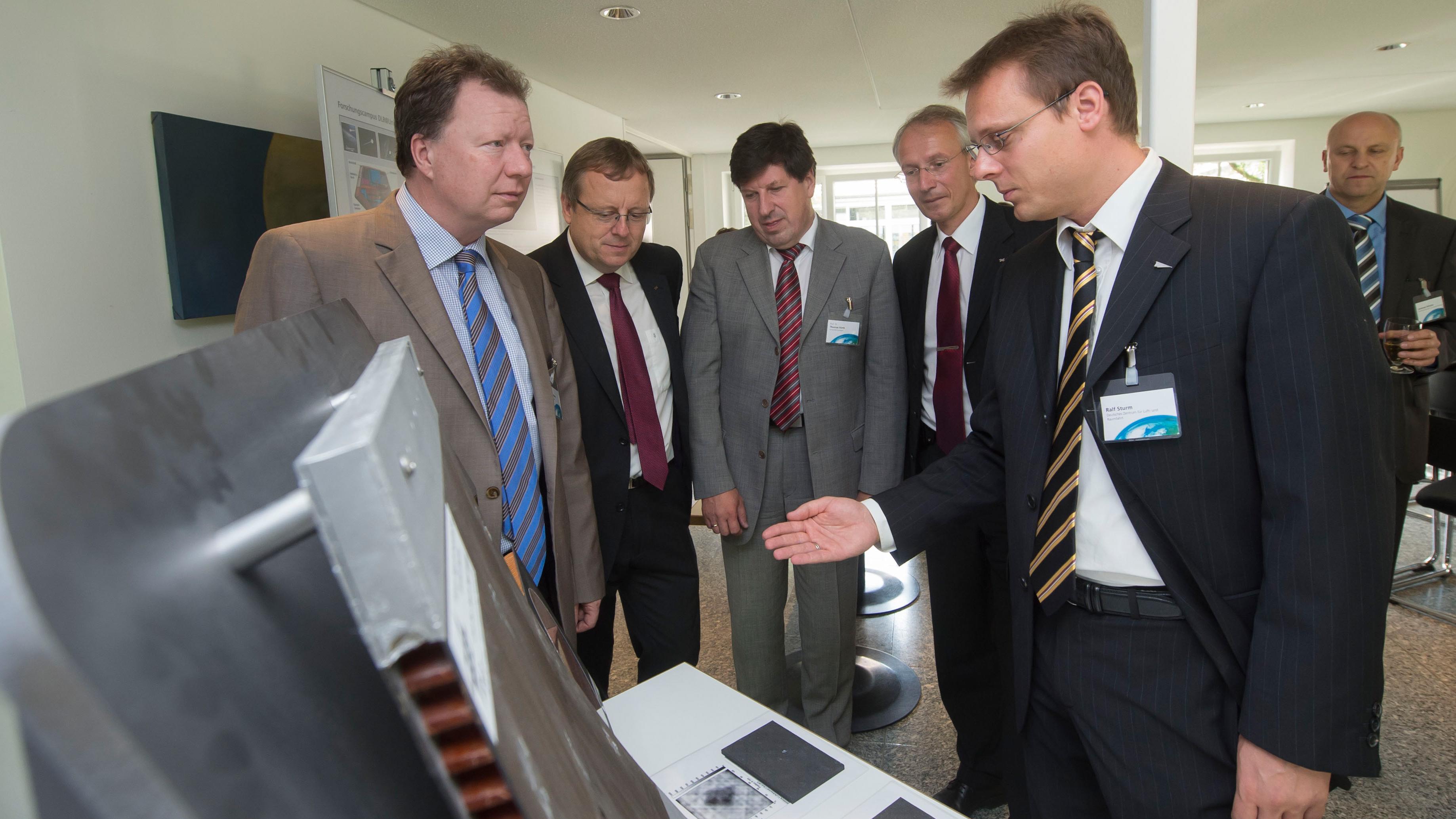 Ralf Sturm, Doktorand im Projekt DLR@UniST, erklärt wie Flugzeuge künftig virtuell zugelassen werden könnten. (v.l.n.r.: Rektor der Universität Prof. Dr. Wolfram Ressel, Vorstandsvorsitzender des DLR Prof. Dr. Johann-Dietrich Wörner, Prof. Dr. Thomas Hirth von der Universität Stuttgart, DLR-Institutsleiter Prof. Dr. Heinz Voggenreiter, Ralf Sturm)