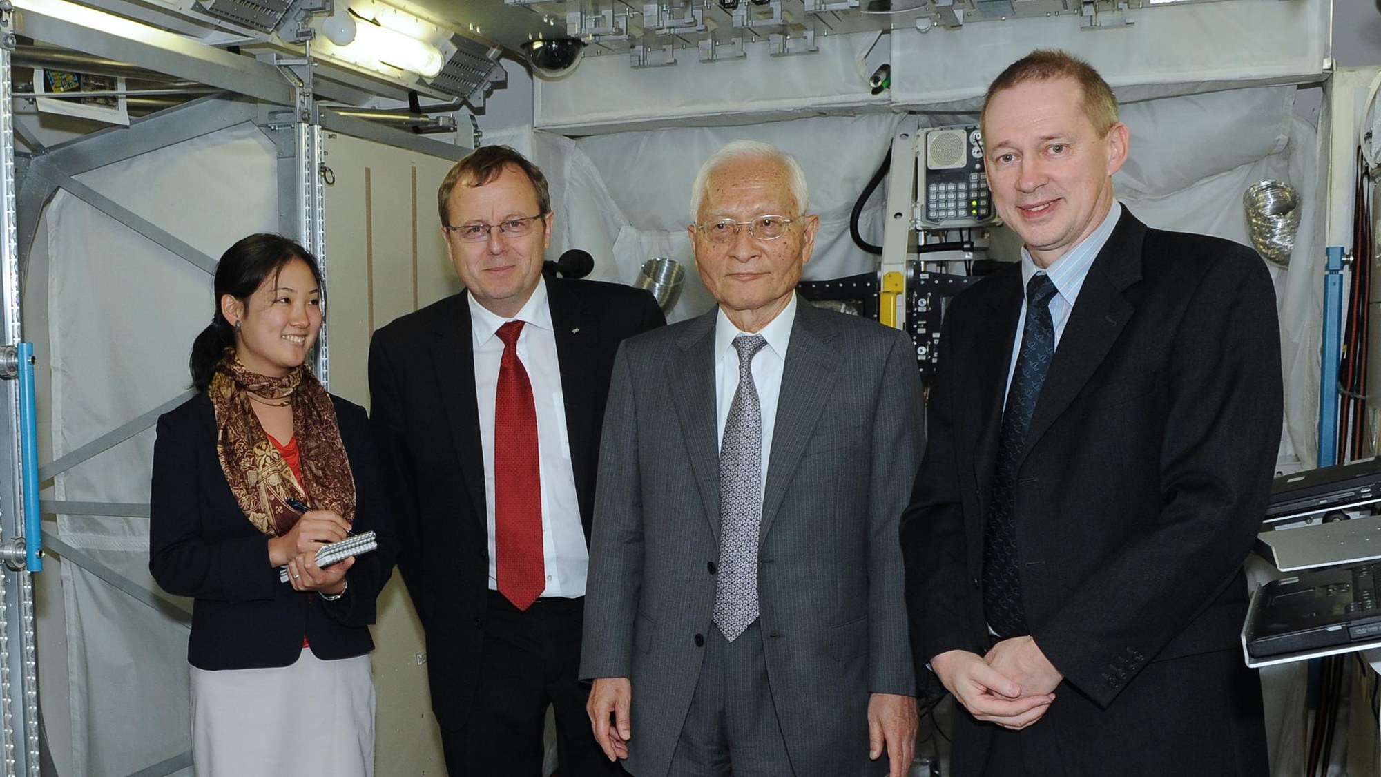 Yoko Shinohe, Prof. Johann-Dietrich Wörner, Dr. Keiji Tachikawa und Frank de Winne (v. l. n. r.) im Nachbau des Columbus-Labors.