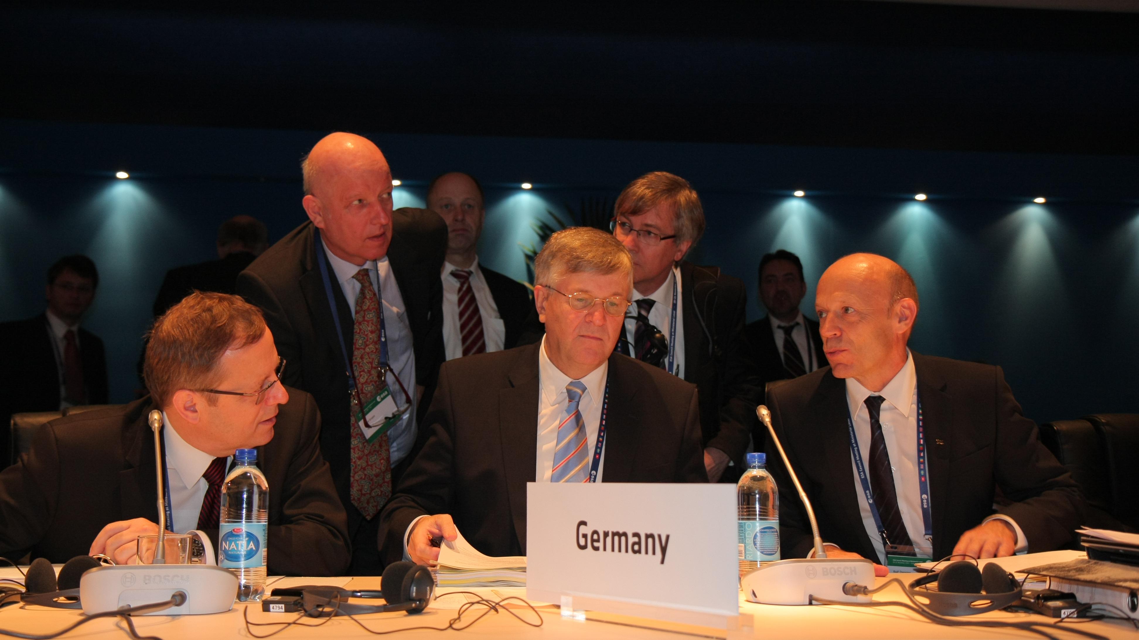 Die Spitzen der deutschen Delegation (vorne von links): Prof. Johann-Dietrich Wörner, DLR-Vorstandsvorsitzender und Delegationsleiter auf Ratsebene, Peter Hintze, Parlamentarischer Staatssekretär im Bundeswirtschaftsministerium und Delegationsleiter auf Ministerebene, Dr. Rolf Densing, ESA-Programmdirektor beim DLR, sowie (hinten von links) Dr. Gerd Gruppe, DLR-Vorstand Raumfahrtmanagement, und vom Bundeswirtschaftsministerium Unterabteilungsleiter Helge Engelhard und Referatsleiter Dr. Karl-Friedrich Nagel.