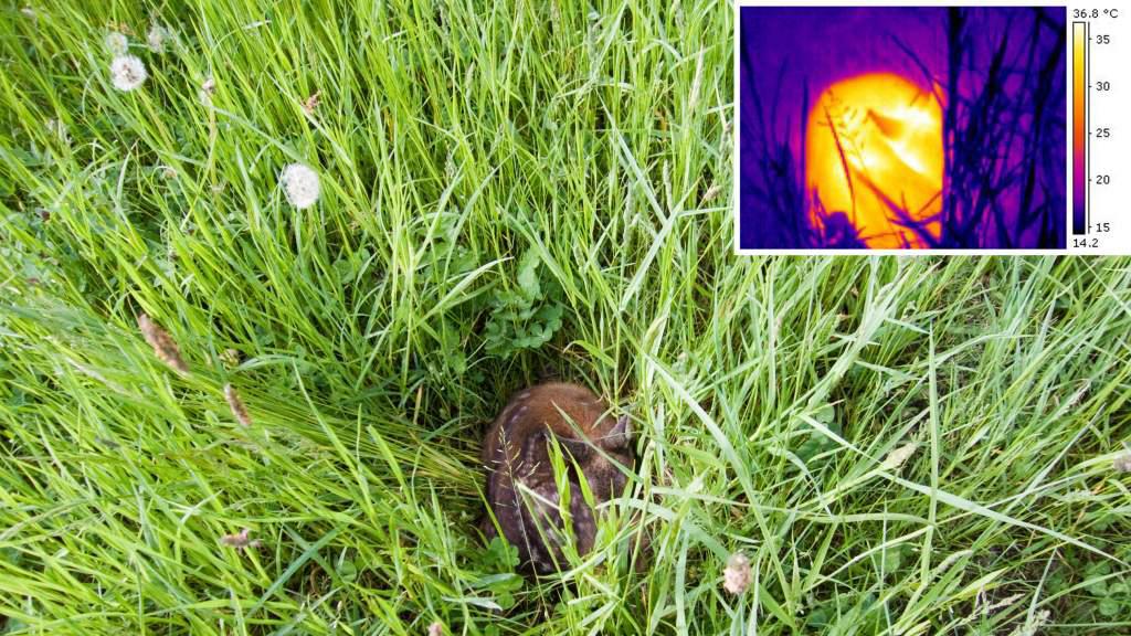 Eine hochauflösende Wärmebildkamera erkennt die gegenüber der Wiesenumgebung erhöhte Temperatur von Tieren im Gras.