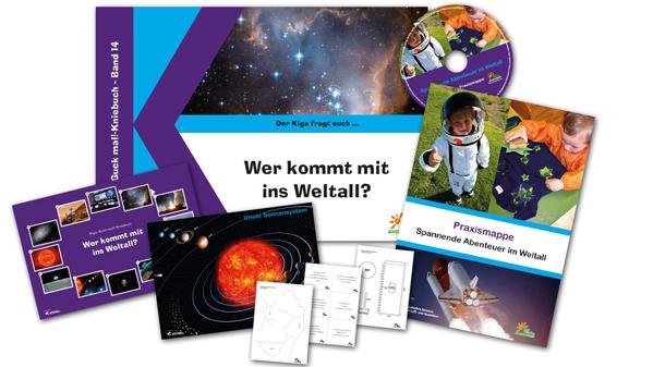 Umfangreiche Materialien zum Thema Weltraum für Kindergärten mit Anleitungen für viele Mitmach-Experimente und Spiele.
