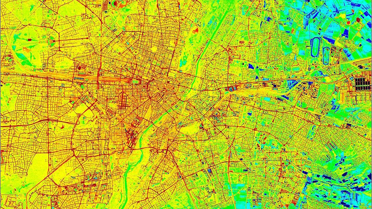 Die nächtlichen Oberflächentemperaturen lassen die Strukturen der Stadt erkennen - Straßenzüge, Wohngebiete und weitläufige Anlagen. Die thermale Luftbildaufnahme vom Juli 2012 zeigt Temperaturen zwischen 1°C (blau) und 25°C (rot). Das vom DLR ausgezeichnetet Projekt "ThermCERT" will thermische Infrarot-Sensordaten einiger GMES Satelliten nutzen, um die Genauigkeit und Qualität von Wärmemessungen zu erhöhen.