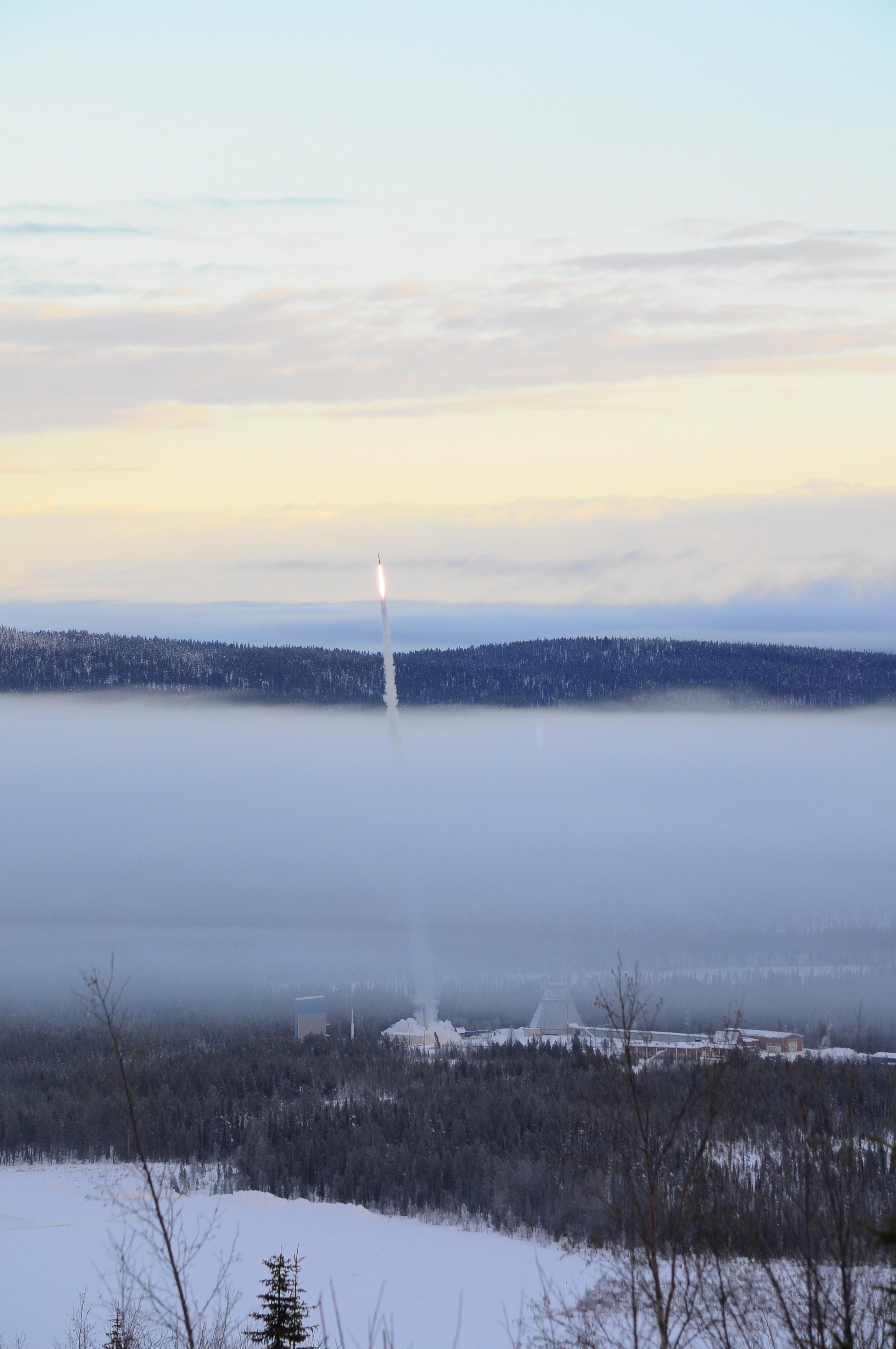 Durch eine dichte Nebelbank startete REXUS 11 am 16. November 2012 um 11.45 Uhr vom Raumfahrtzentrum Esrange bei Kiruna in Schweden.