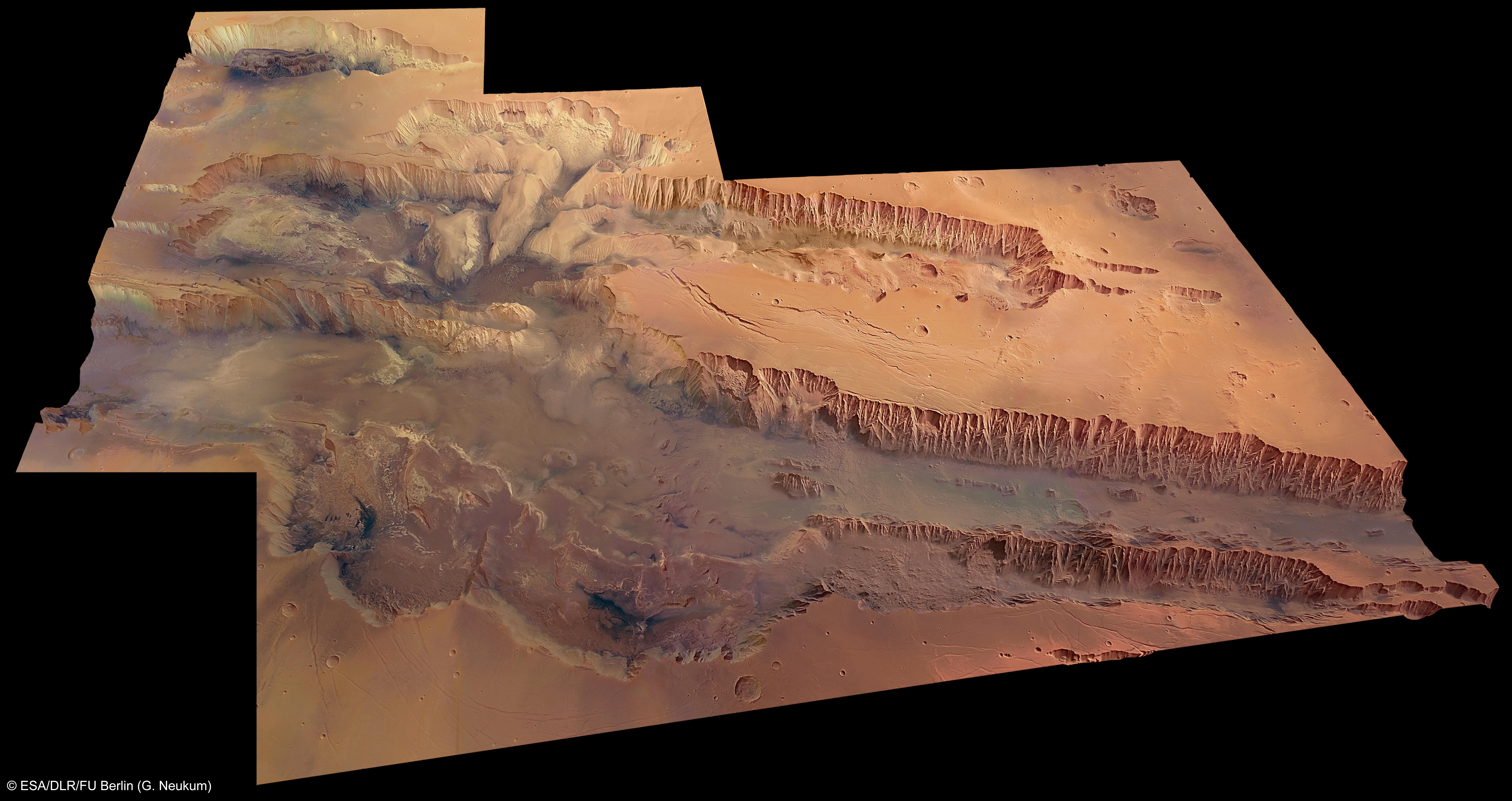 Dieser bis zu elf Kilometer tiefe und bis zu 200 Kilometer breite Grabenbruch erstreckt sich über fast 4000 Kilometer in Ost-West-Richtung entlang des Äquators durch das Marshochland. Das Bild zeigt den zentralen Abschnitt und den östlichen Teil aus der Perspektive der Raumsonde Mars Express. Die einzelnen Bildstreifen der HRSC sind jeweils nur zwischen 50 und 200 Kilometer breit (abhängig von der Überflughöhe), so dass diese Ansicht der Valles Marineris erst mit einem Mosaik aus 20 Einzelaufnahmen der HRSC möglich wurde. Zur besseren Darstellung wurden hier die Höhen vierfach überhöht, das heißt, die Abhänge und Bergflanken erscheinen steiler als in Wirklichkeit. Auch die Farben in diesem Bild sind leicht verfälscht. Durch eine Steigerung des Kontrasts in den einzelnen Farbkanälen werden so manche eher unscheinbaren Geländemerkmale dieser geologisch äußerst komplexen Region oder Unterschiede in der Zusammensetzung der Oberfläche deutlicher sichtbar.
