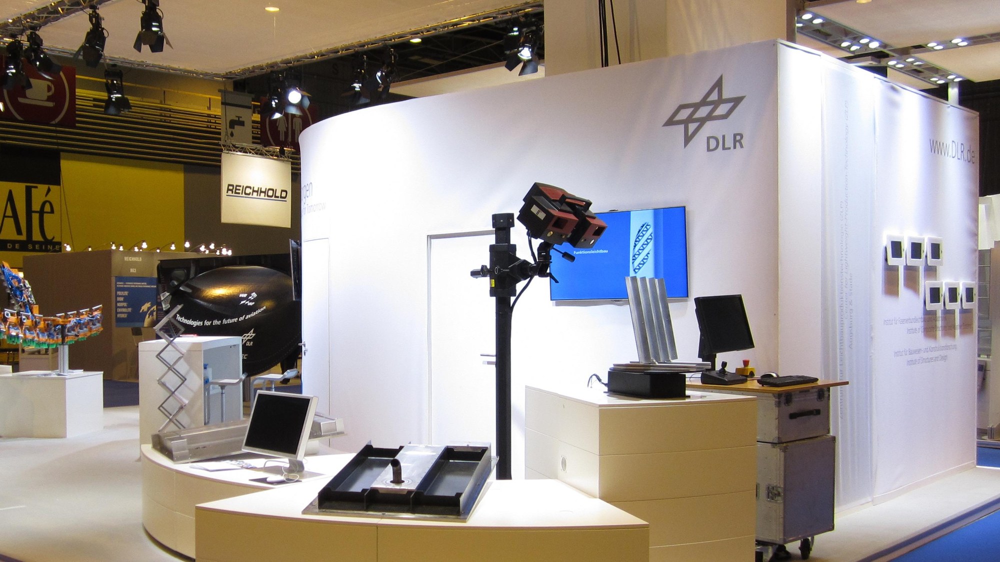 Ein optischer 3D-Scanner zur Vermessung und Bewertung der Flügelwelligkeit steht neben der im DLR entwickelten hochgenauen Flügelschale in CFK-Leichtbauweise.