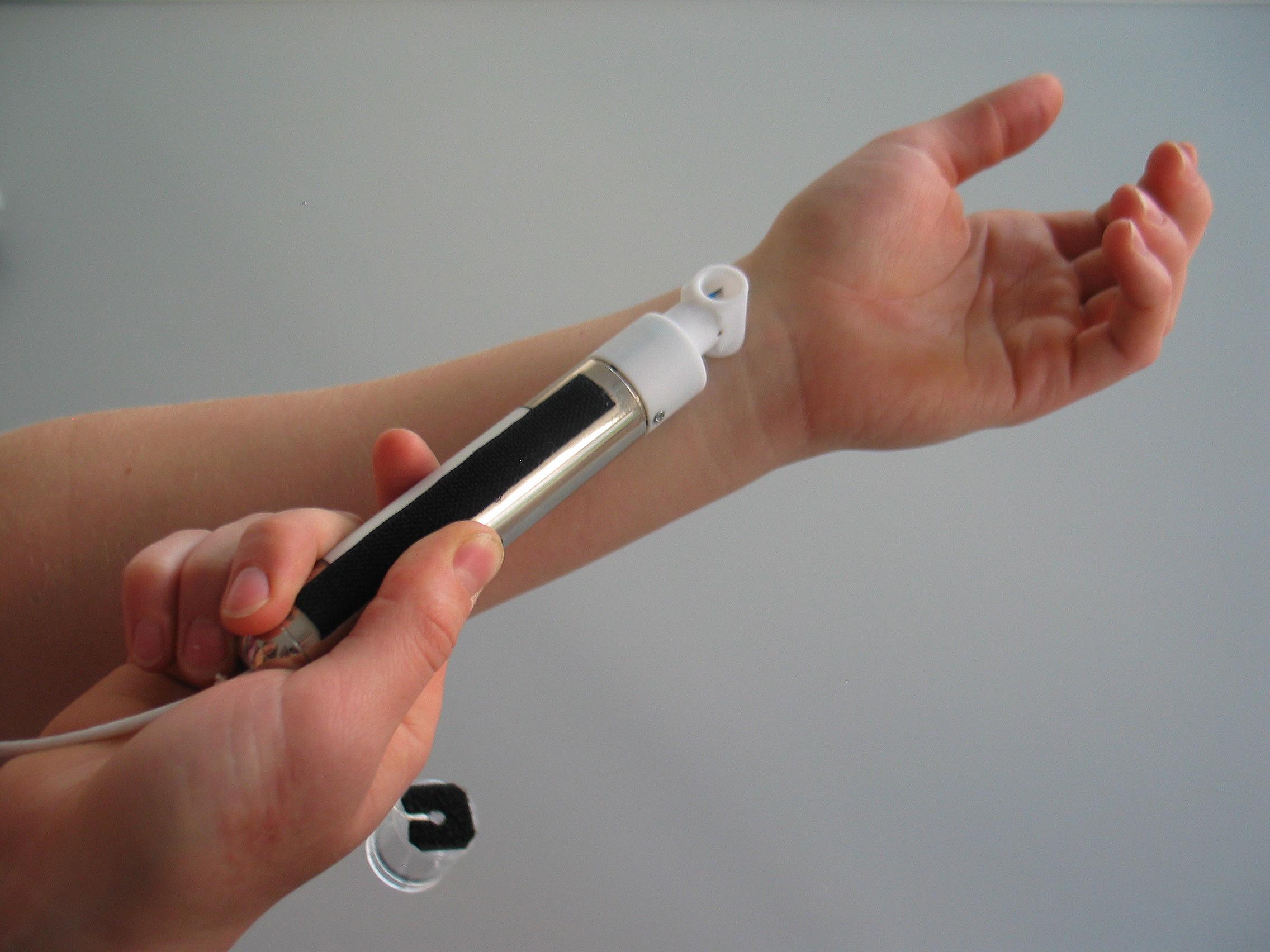 Mit dem so genannten Tewameter wird der Wasserverlust durch die Haut gemessen. Die Mess-Sonde ist Teil des ISS-Experiments SKIN B. Dieses untersucht den Einfluss der Schwerelosigkeit auf die menschliche Haut.