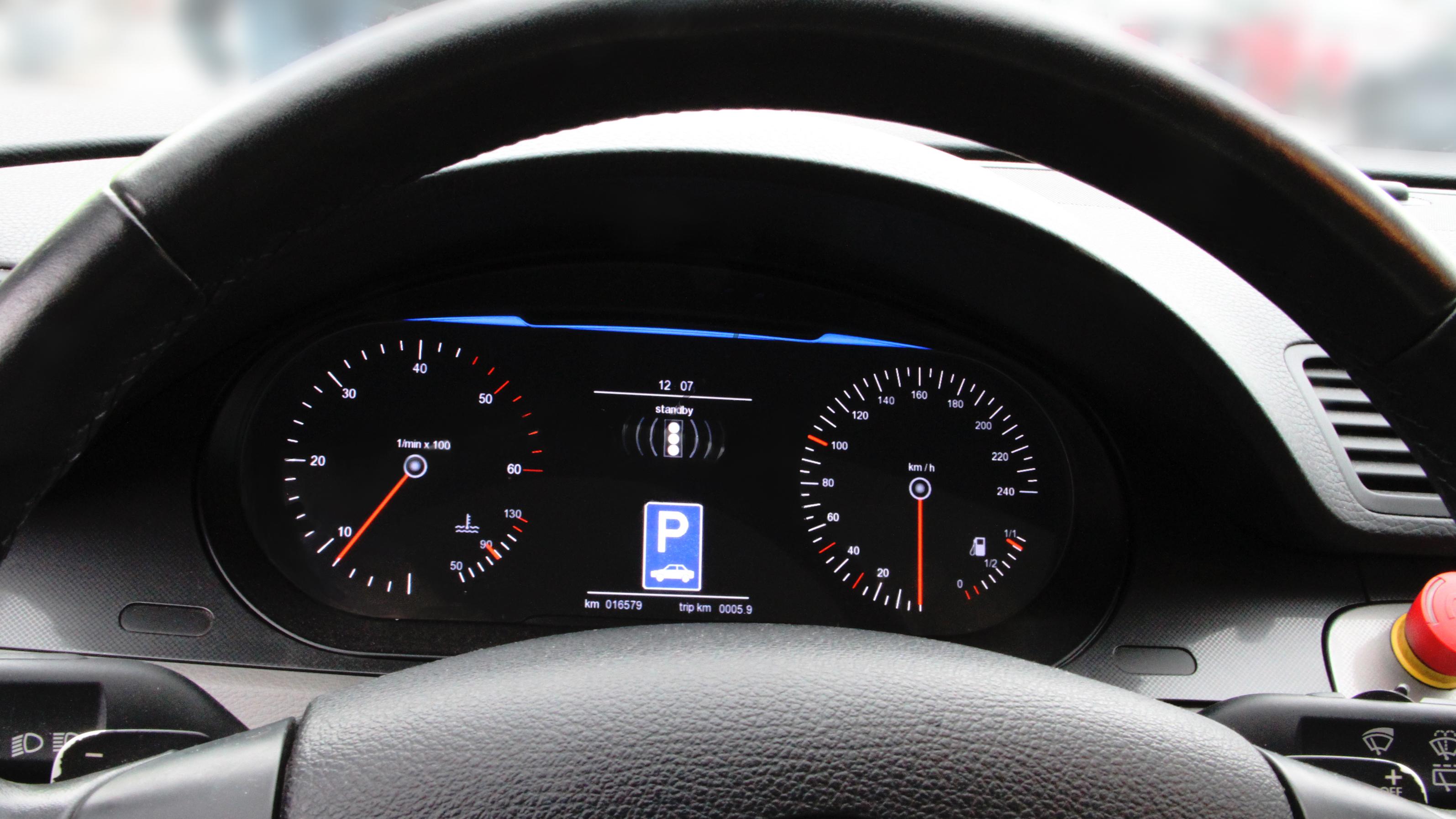 Das Parksymbol im Display des Fahrzeugs signalisiert einen freien Parkplatz. Im Januar 2013 testen Verkehrsforscher des Deutschen Zentrum für Luft- und Raumfahrt (DLR) in Braunschweig eine hochautomatisierte Parkplatzsuche.