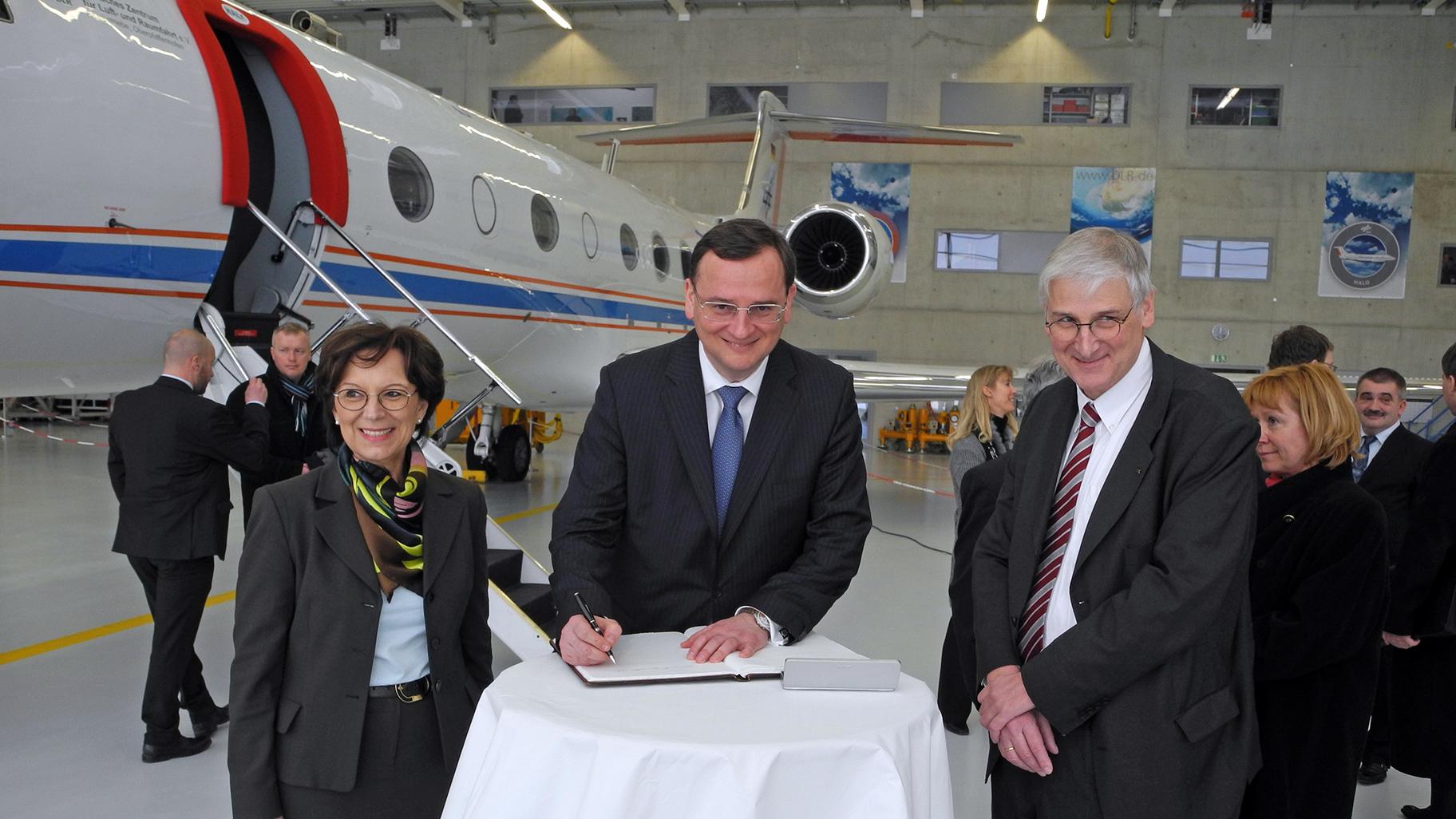 Zum Abschluss seines Besuches im DLR Oberpfaffenhofen, widmete der tschechische Premierminister Nečas, (links) seinem Gastgeber (DLR-Vorstandsmitglied Dittus, rechts) eine Eintragung in das Gästebuch.