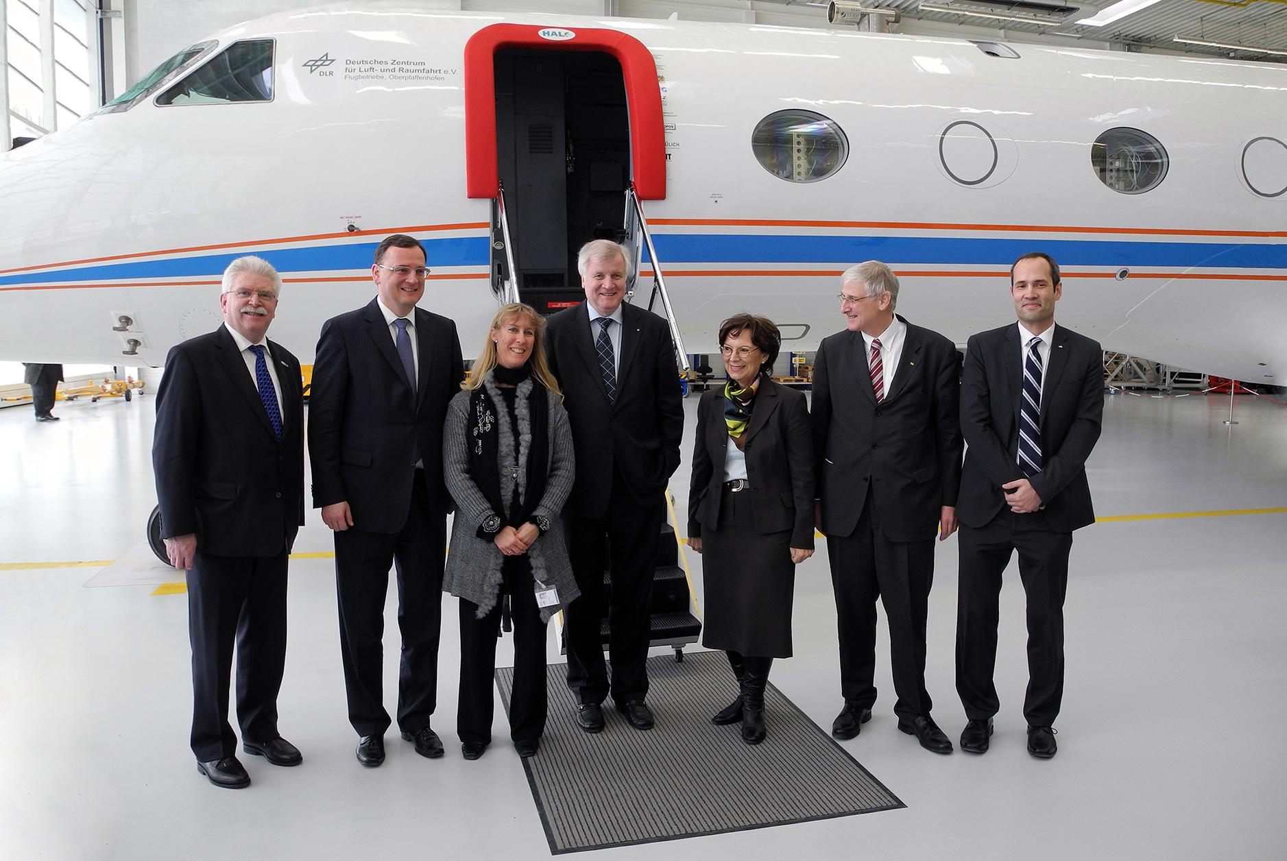 Die tschechische und bayerische Ministerdelegation zeigte sich unter anderem an der aktuellen Atmosphären- und Klimaforschung des DLR interessiert. Die Forschungsflugabteilung präsentierte dazu das modernste Forschungsflugzeug Europas: HALO (High Altitude and Long Range Research Aircraft). Im Bild (v.l.n.r.): Martin Zeil, Staatsminister für Wirtschaft, Infrastruktur, Verkehr und Technologie - Petr Nečas, Premierminister der Tschechischen Republik - Horst Seehofer, Ministerpräsident des Freistaates Bayern - Prof. Hansjörg Dittus, DLR-Vorstandsmitglied für den Bereich Raumfahrtforschung und -technologie - Oliver Brieger, Technischer Leiter der DLR-Flugexperimente.