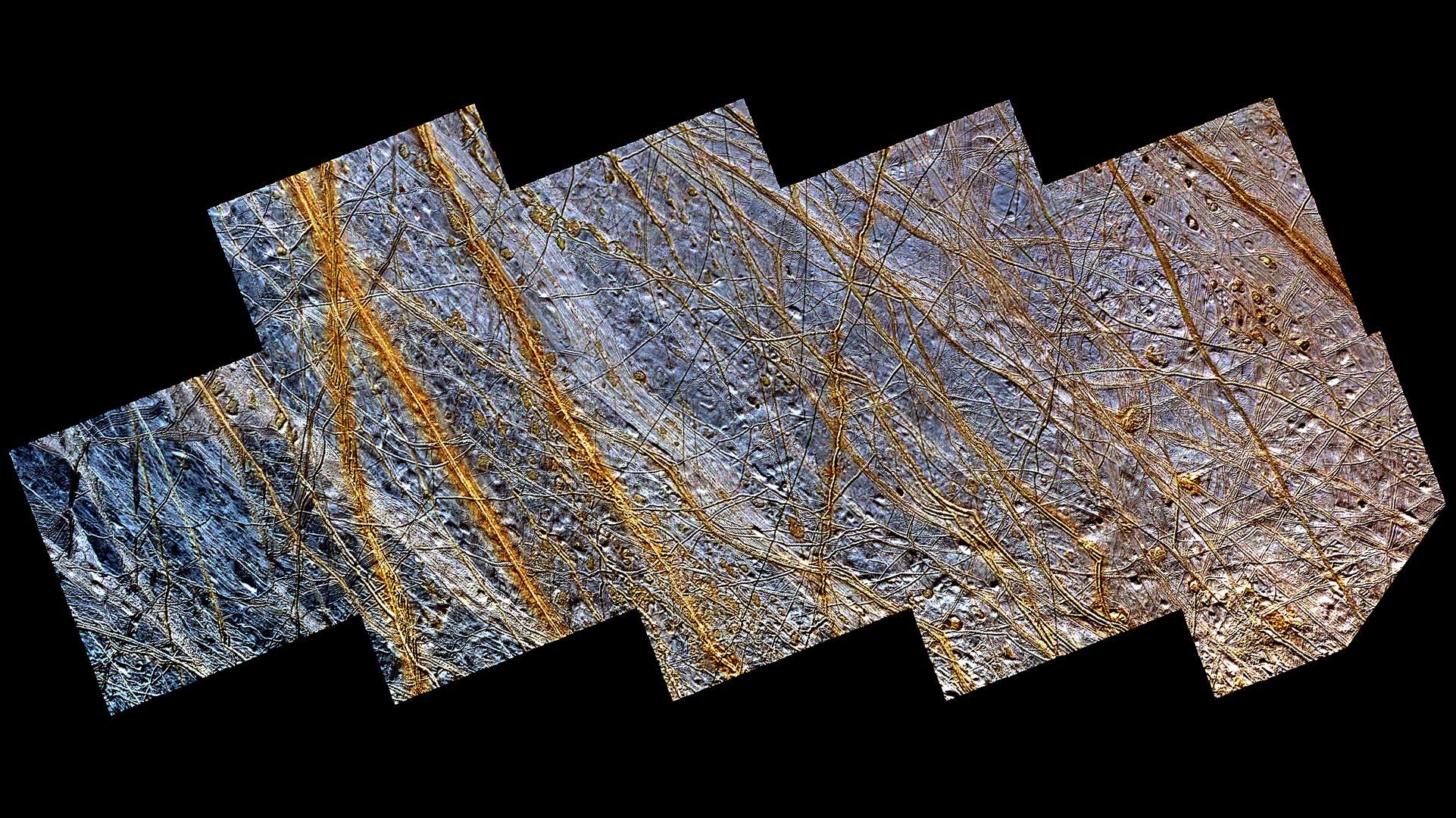 Dieses Bildmosaik einer Region auf der südlichen Hemisphäre des Jupitermondes Europa beinhaltet zahlreiche Oberflächenmerkmale, die typisch für die Eiskruste dieses Mondes sind. Bräunlich gefärbte, geradlinig verlaufende (Doppel-)Bergrücken erstrecken sich quer über den Bildausschnitt. Dabei könnte es sich um gefrorene Überbleibsel einstiger "kryo"-vulkanischer Tätigkeit auf dem Mond handeln. Dunkle Flecken von mehreren Kilometern Durchmesser finden sich fast überall auf dem gezeigten Bildausschnitt. Aus welchen Substanzen sich die doppelten Bergrücken und die dunklen Flecken zusammensetzen, ist nicht eindeutig geklärt. Eine (geologisch ältere) blaue Oberfläche, die aus fast reinem Wassereis besteht, liegt unter den Doppelgraten. Der Bildausschnitt deckt etwa eine Fläche von 800 Kilometer mal 350 Kilometer ab. Die Bildauflösung beträgt 230 Meter pro Bildpunkt. Die Farben wurden kontrastverstärkt, um morphologische Details und die Oberflächenzusammensetzung besser zu betonen. Die Aufnahmen wurden mit dem digitalen Kamerasystem an Bord der NASA-Raumsonde Galileo während zweier unterschiedlicher Orbits gewonnen.