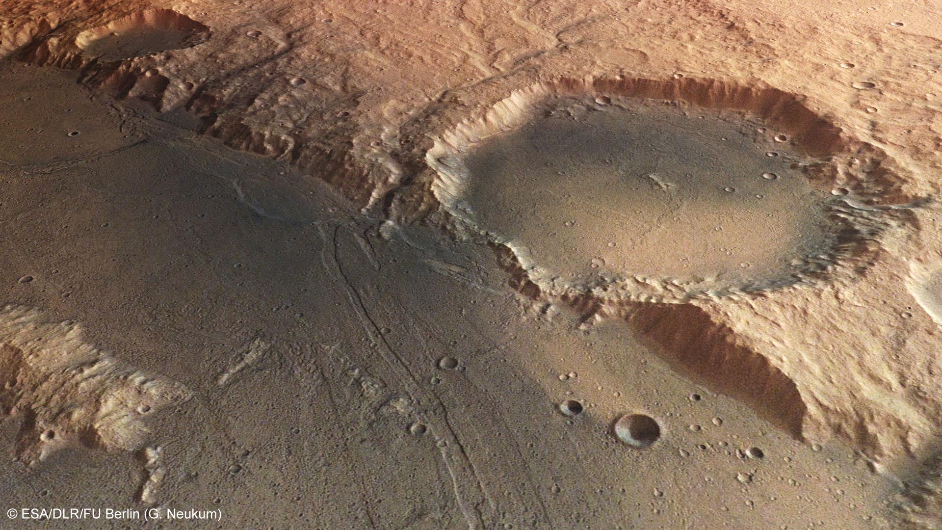 Auf dem Boden des Palos-Kraters, dessen Westteil im Bildvordergrund zu sehen ist, wurden Sedimente angelagert, die eine Ebene bilden. Diese steht in starkem Kontrast zur rauhen Oberfläche des umgebenden Hochlandes. Auch das Innere des markanten Kraters in der oberen Bildhälfte - mit einem Durchmesser von knapp 25 Kilometern ist er etwa so groß wie das Nördlinger Ries in Bayern - ist von diesen Ablagerungen angefüllt. Der Wind hat stellenweise dunklen Staub und Sand von erodiertem vulkanischen Gestein abgelagert.