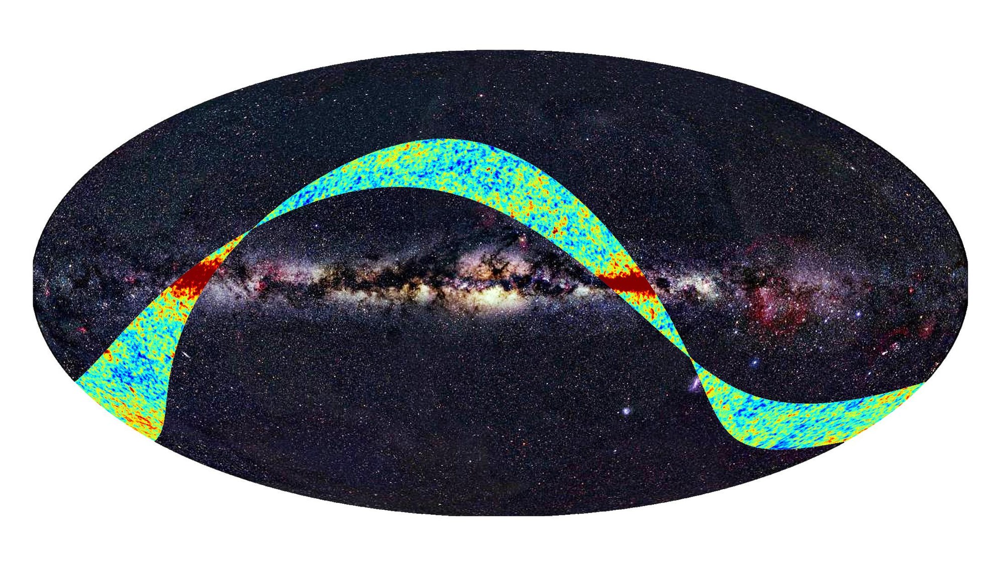 Die Himmelskarte auf der Basis optischer Wellenlängen zeigt in der Mitte horizontal die Milchstraße. Das darübergelegte Band veranschaulicht das Gebiet des von Planck während der ersten Beobachtung aufgenommenen Himmels, das am 18. September 2009 veröffentlicht wurde. Die Farbskala gibt die Temperaturschwankungen der von Planck aufgenommenen kosmischen Hintergrundstrahlung wieder (rot ist wärmer, blau kälter).