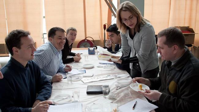 Natalia Rakova aus dem Team von Prof. Jens Titze erläutert den Mars500-Probanden die Zusammensetzung ihres Speiseplans. Das Experiment zum Salzhaushalt der "Marsonauten" wurde vom Raumfahrtmanagement des Deutschen Zentrums für Luft- und Raumfahrt (DLR) gefördert.