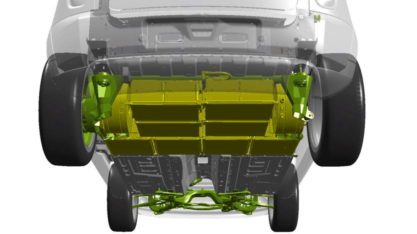 Ansicht des Demonstrators von unten - mit Batterie und elektrisch angetriebener Hinterachse.
