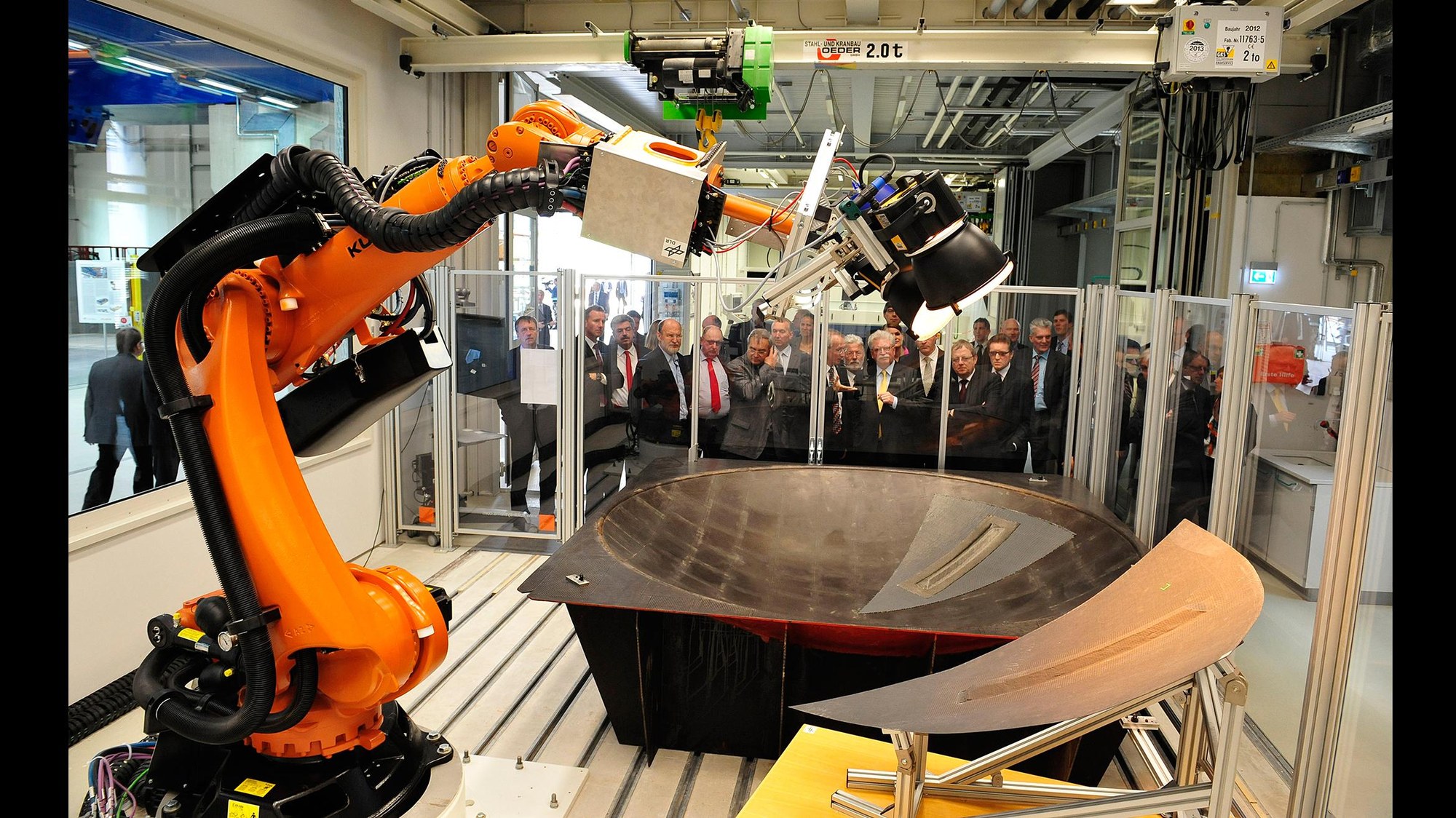 Der Rundgang führte die Delegation aus Politik, Wirtschaft und Wissenschaft unte anderem in das Qualitätssicherungslabor des ZLP. Das Labor ist mit einer Roboterzelle ausgestattet, die den DLR-Wissenschaftlern dabei hilft, die CFK-Bauteile zu überprüfen. Dieser Vorgang ist in den laufenden Produktionsprozess integriert.