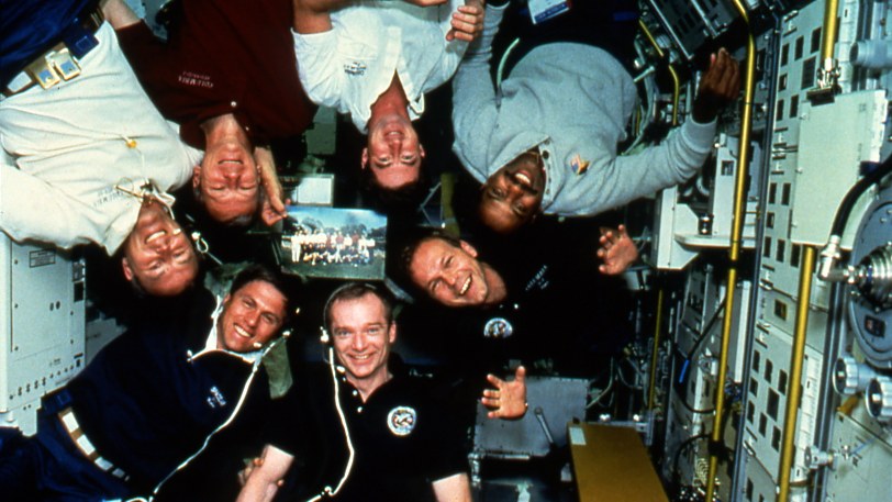 Die Crew der deutschen D2-Mission: Hans Schlegel, Ulrich Walter, Steven Nagel, Terence Hernicks, Jerry Ross, Charles Precourt und Bernhard Harris.