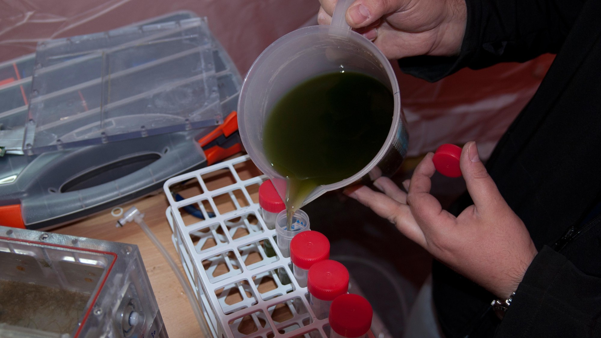 Proben der Algenlösung aus Omegahab werden noch am Landeort für spätere molekularbiologische Untersuchungen abgefüllt und chemisch fixiert.