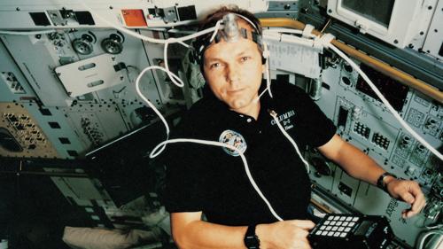 Astronaut Hans Schlegel im Spacelab: An seiner Stirn trägt er ein Ultraschallmessgerät. Mit dem Experiment AR-TISSU wurden Gewebedicke und Gewebestabilität entlang der Körperachse unter Mikrogravitationsbedingungen erforscht. Die Aufnahme entstand während der D2-Mission 1993.