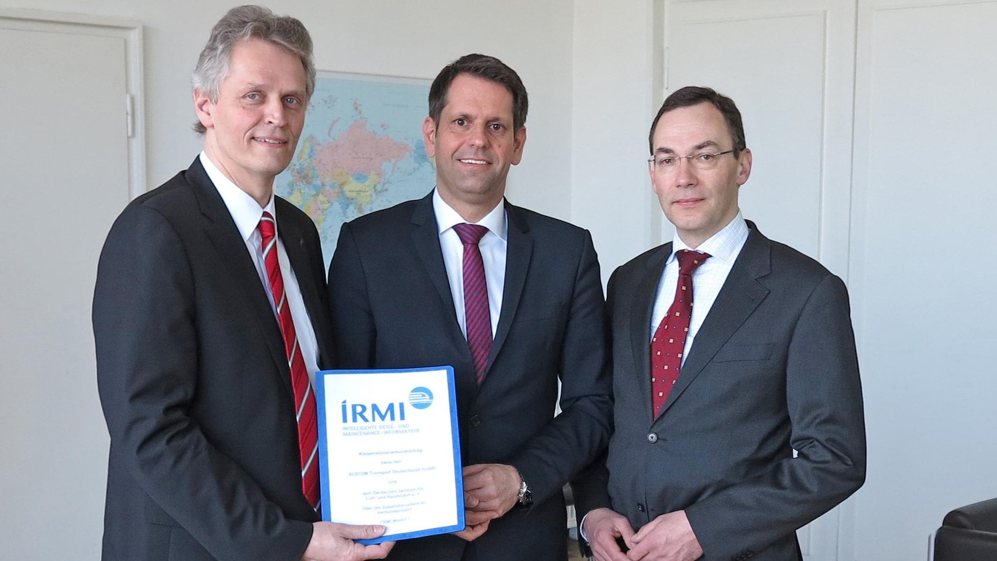 Für die intelligente Informationsplattform IRMI arbeiten der Zughersteller Alstom und Deutsche Zentrum für Luft- und Raumfahrt (DLR) zusammen. Das niedersächsische Ministerium für Wirtschaft, Arbeit und Verkehr fördert das Projekt mit 660.000 Euro. Am 19. April 2013 wurde in Hannover der Kooperationsvertrag unterzeichnet und der Förderbescheid übergeben. Von links: Prof. Carsten Lemmer, Leiter des DLR-Instituts für Verkehrssystemtechnik, Olaf Lies, Minister für Wirtschaft, Arbeit und Verkehr in Niedersachsen und Dr. Martin Lange, Vorstand bei Alstom Deutschland AG für die Sparte Transport.