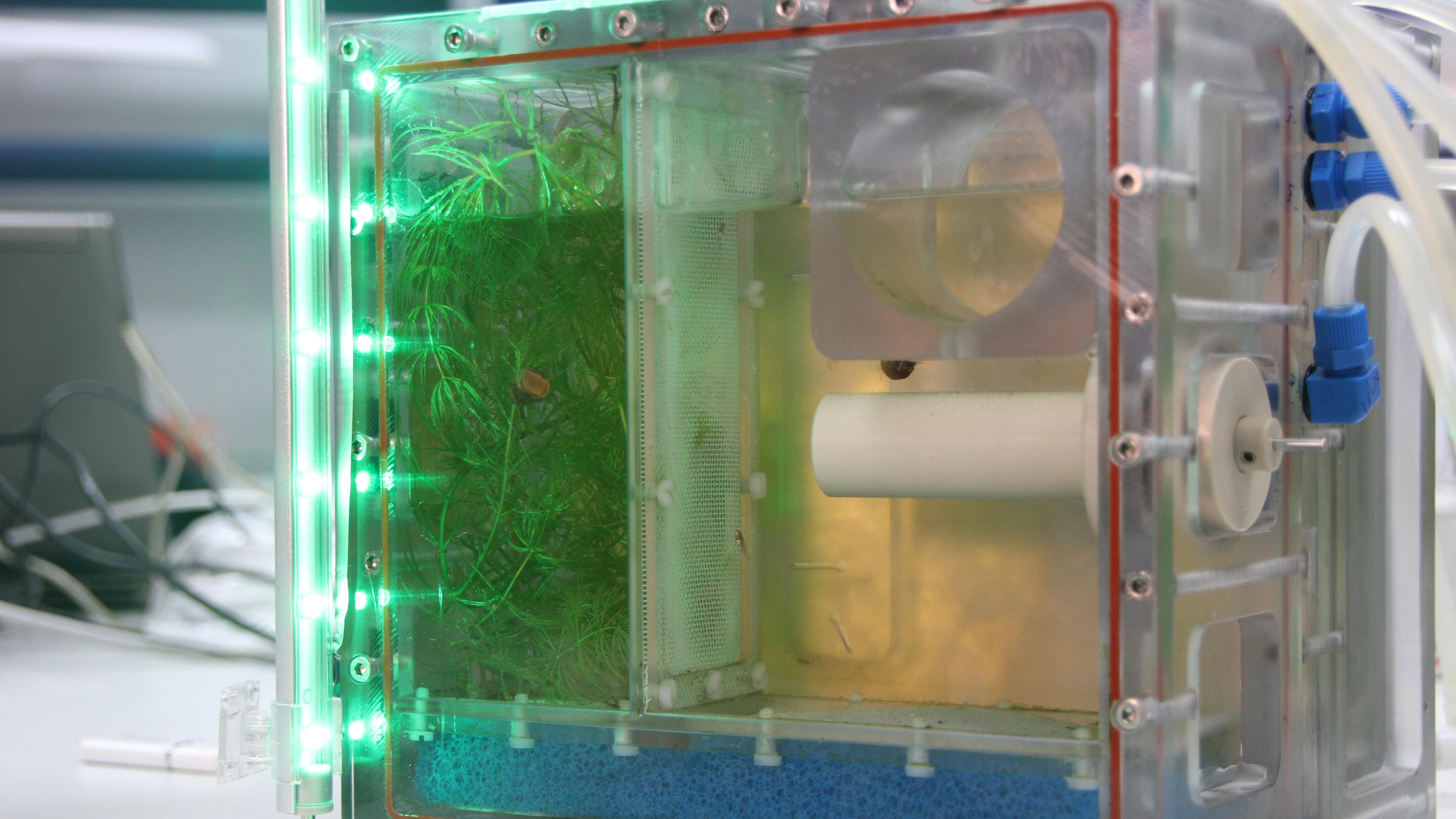 Für das vom DLR Raumfahrtmanagement geförderte "Omegahab" haben Biologen und Zoologen der Universitäten Erlangen und Hohenheim ein aus zwei Kammern bestehendes Aquarium entwickelt; in der Schwerelosigkeit soll es als bioregeneratives Lebenserhaltungssystem mit eigenem Nährstoff- und Gasaustausch funktionieren. Links ist das Hornkraut zu sehen, unten der Filter und rechts eine Schnecke im Fischabteil. In dem runden Abteil oben rechts werden die Fischeier eingesetzt - der Futterautomat für die späteren Larven und auch für die Fische befindet sich darunter.