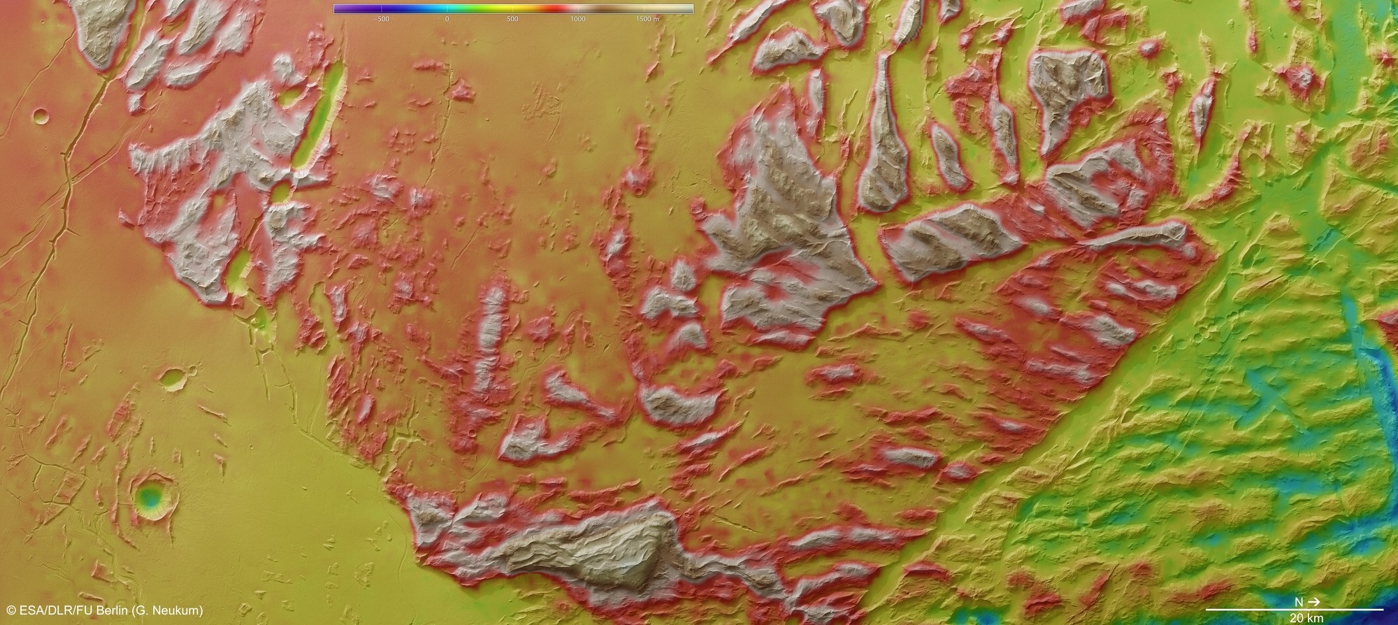 Mit der hochauflösenden Stereokamera HRSC lassen sich digitale Geländemodelle ableiten, die mit Falschfarben bildhaft die Topographie der Region erkennen lassen. Die Zuordnung der Höhen ist an einer Farbskala links oben abzulesen; Norden ist im Bild rechts. Die Region Sulci Gordii befindet sich etwa 200 Kilometer östlich des Olympus Mons, des höchsten Vulkans unseres Sonnensystems. Die beeindruckende Landschaft wurde von gewaltigen Erdrutschen, Lavaströmen und tektonischen Kräften geformt, die mit der einstigen vulkanischen Aktivität des Olympus Mons zusammenhängen.