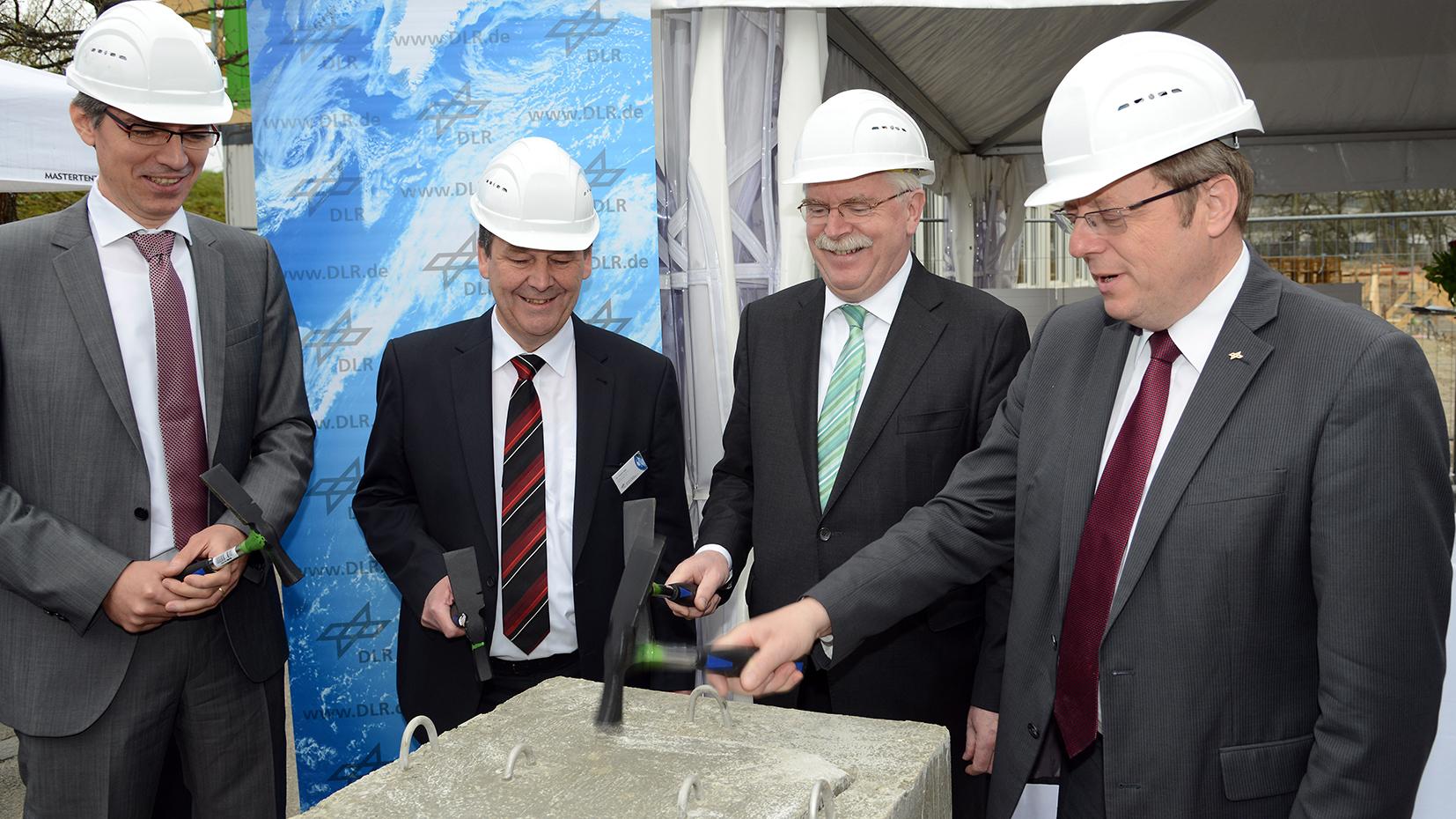 Mit jeweils drei Hammerschlägen wurde der Grundstein von den Akteuren versiegelt (v.l.n.r.): Prof. Dr. Alin Albu-Schäffer, Direktor des DLR-Instituts für Robotik und Mechatronik, Dr.-Ing. Johann Bals, Direktor des DLR-Instituts für Systemdynamik und Regelungstechnik, Martin Zeil, Bayerischer Staatsminister für Wirtschaft, Infrastruktur, Verkehr und Technologie, und Prof. Dr.-Ing. Johann-Dietrich Wörner, Vorstandsvorsitzender des DLR.