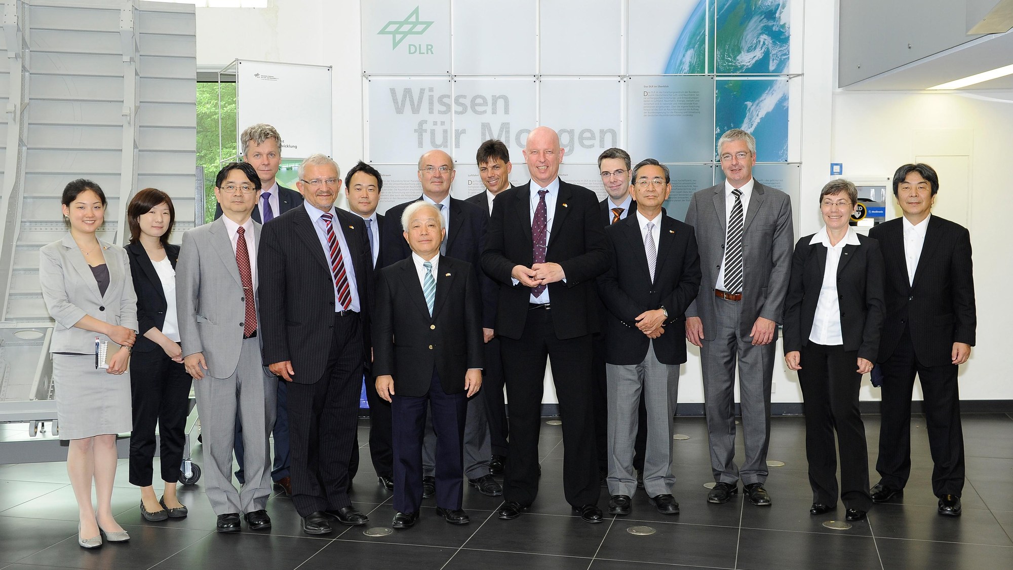 Während seines Besuchs beim Deutschen Zentrum für Luft- und Raumfahrt (DLR) lernten der Präsident der japanischen Raumfahrtagentur JAXA, Dr. Naoki Okumura, (Mitte) und seine Delegation unter anderem das DLR-Institute für Luft- und Raumfahrtmedizin sowie für Antriebstechik und das Nutzerzentrum für Weltraumexperimente kennen.