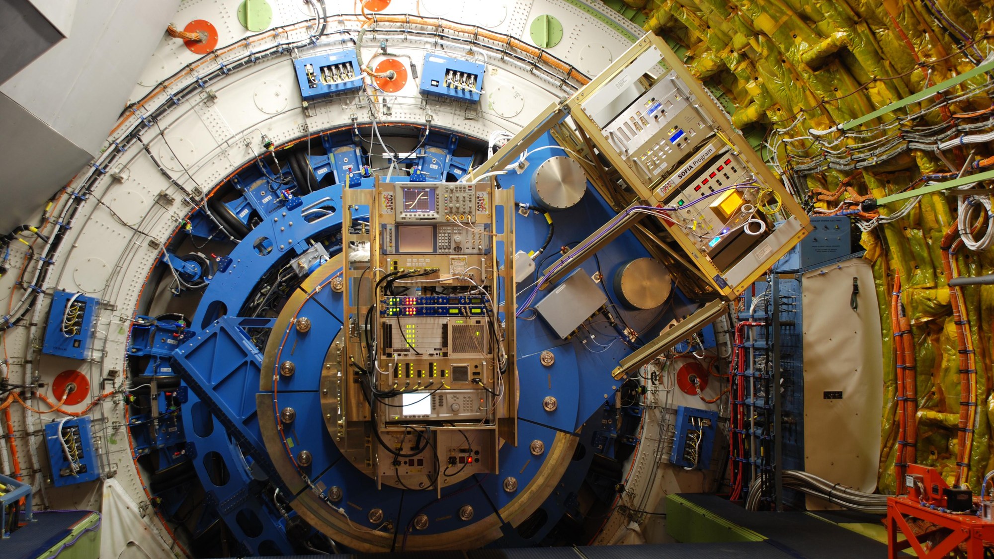 Das Spektrometer GREAT für Messungen im fernen Infrarotbereich (das goldfarbene vertikale Instrument im Vordergrund) wurde für die Dauer des ersten Einsatzes auf der Südhalbkugel an SOFIAs Teleskop installiert.