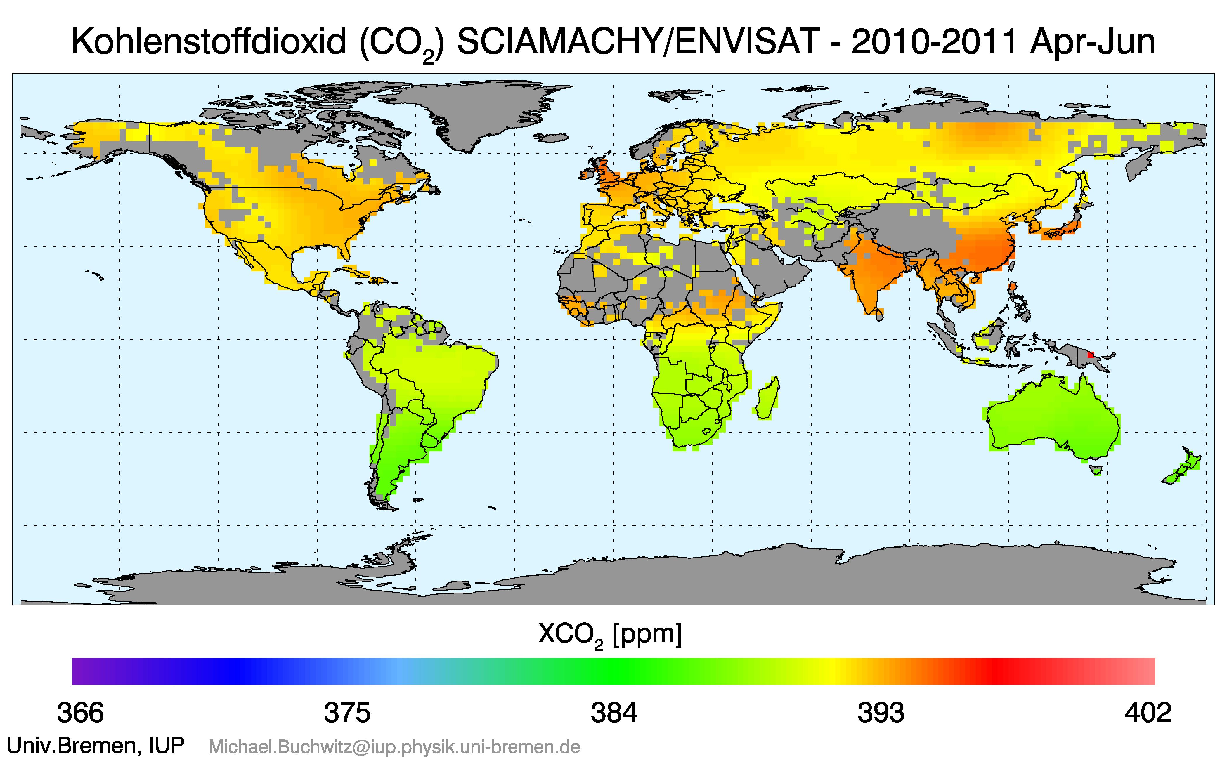 Auf der Karte ist ist die weltweite Verteilung des Treibhausgases Kohlenstoffdioxid zu sehen, die SCIAMACHY in den Jahren 2010 und 2011 jeweils in den Monaten von April bis Juni gemessen hat.