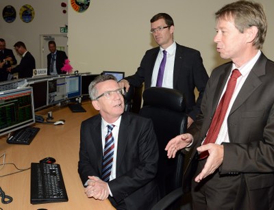 Im Nationalen Raumfahrtkontrollzentrum des DLR bekam der Bundesminister einen Einblick in die Kontrollräume der bemannten Mission für das europäische Labormodul Columbus auf der Internationalen Raumstation (ISS). Im Bild: Dr. Thomas de Maizière (links), Bundesminister der Verteidigung, im Gespräch mit Dr. Dieter Sabath (rechts), Projektleiter des Columbus-Missionsbetriebes.