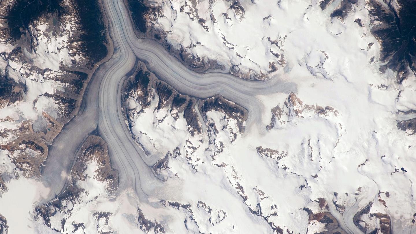 Das Heiltskuk-Eisfeld in British Columbia umfasst 3.600 Quadratkilometer. Die zwei größten Gletscher dieses Eisfelds sind der Silverthrone- und der Klinaklini-Gletscher. Das Bild wurde von der Internationalen Raumstation ISS aufgenommen.