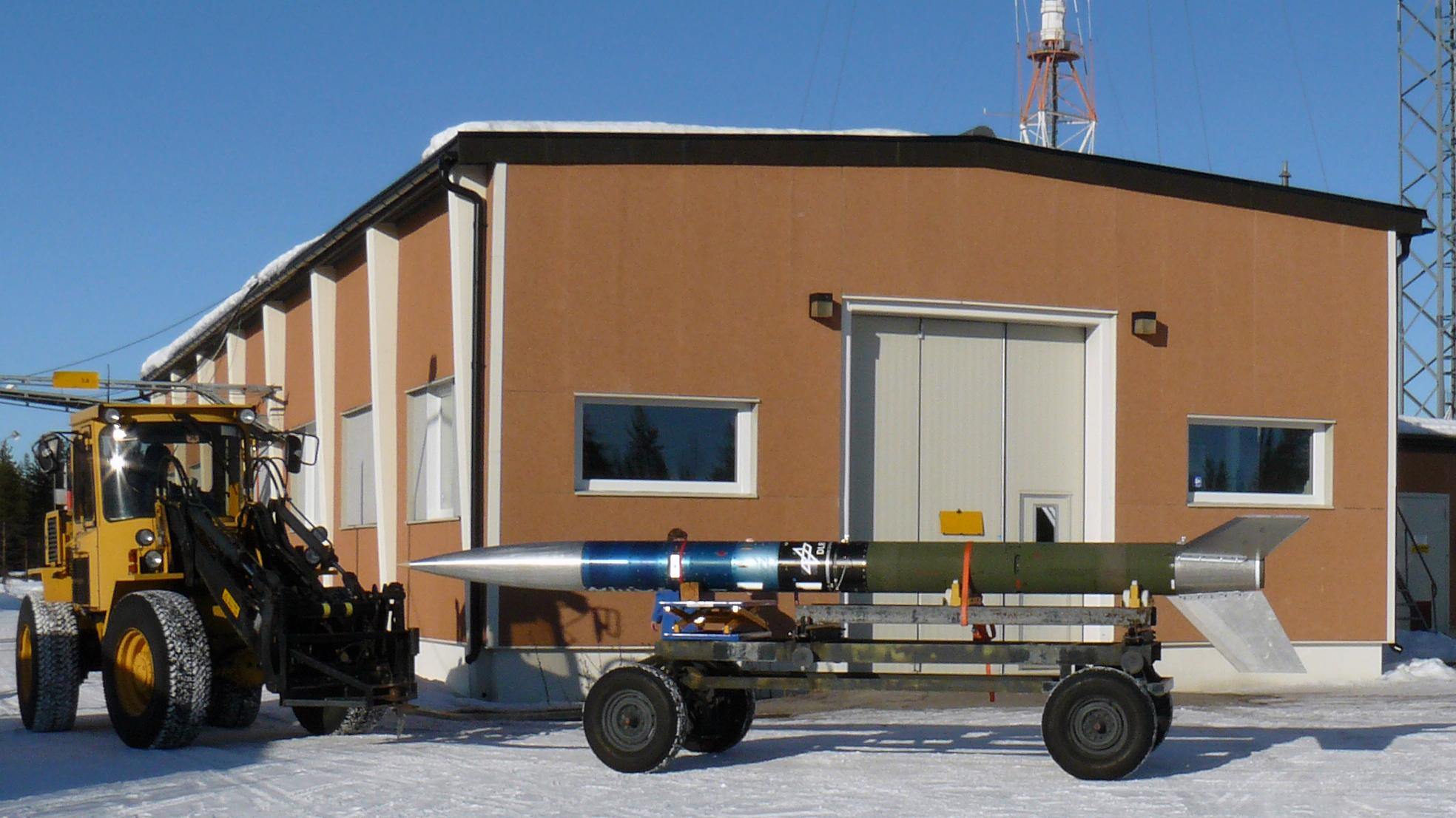 Nach dem Test aller Experimente und Systeme wird die fertig zusammengebaute REXUS-Rakete zur Startrampe gebracht. Deutlich sind alle Elemente der Rakete zu erkennen: die Spitze, die Experimentmodule (dunkelblau), das Servicemodul (hellblau), das Bergungssystem (schwarz mit DLR Logo), der Motoradapter (schwarz) und der Motor mit den Finnen.