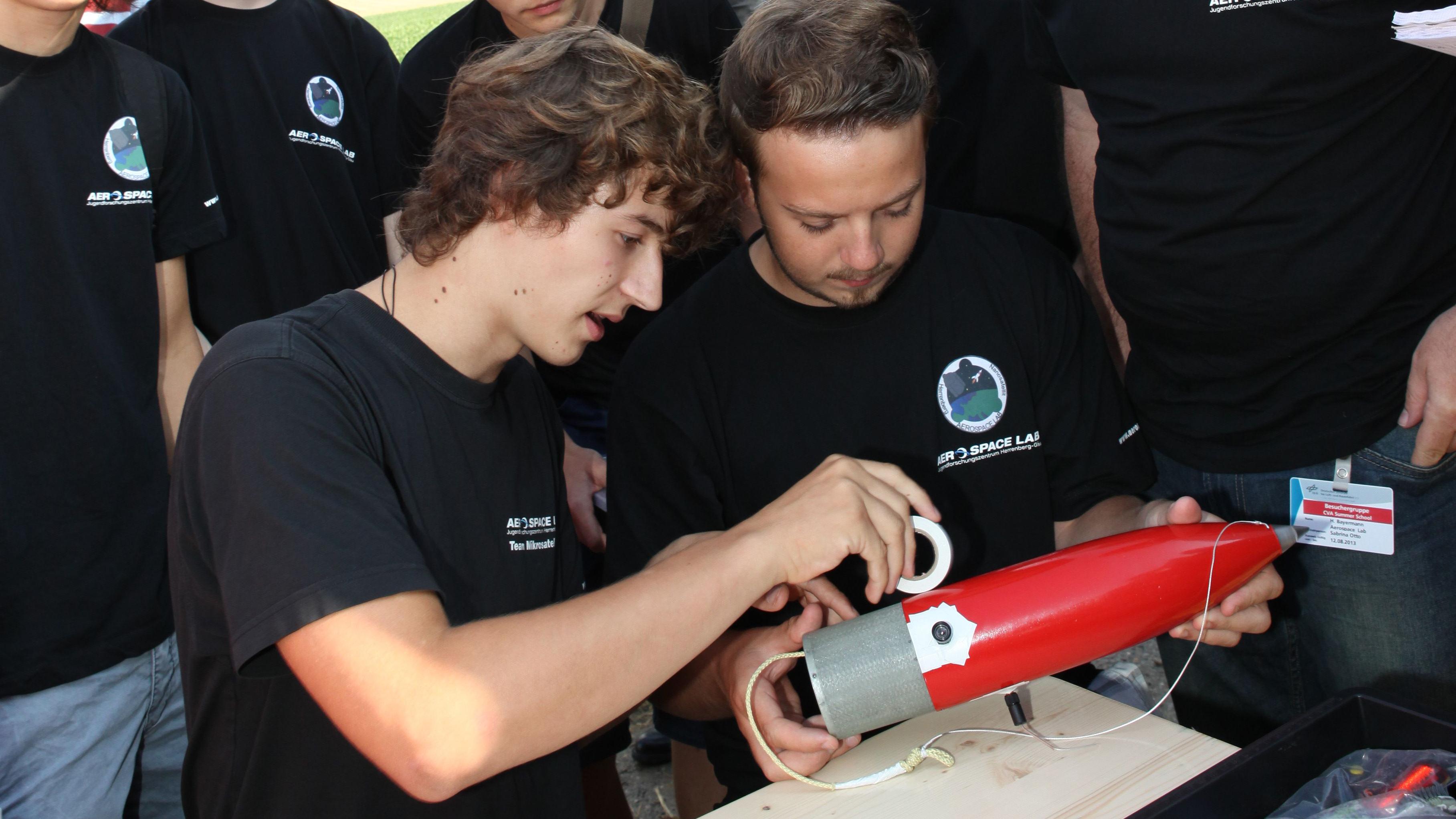 Der kleine Satellit wird für den Flugwettbewerb vorbereitet.
