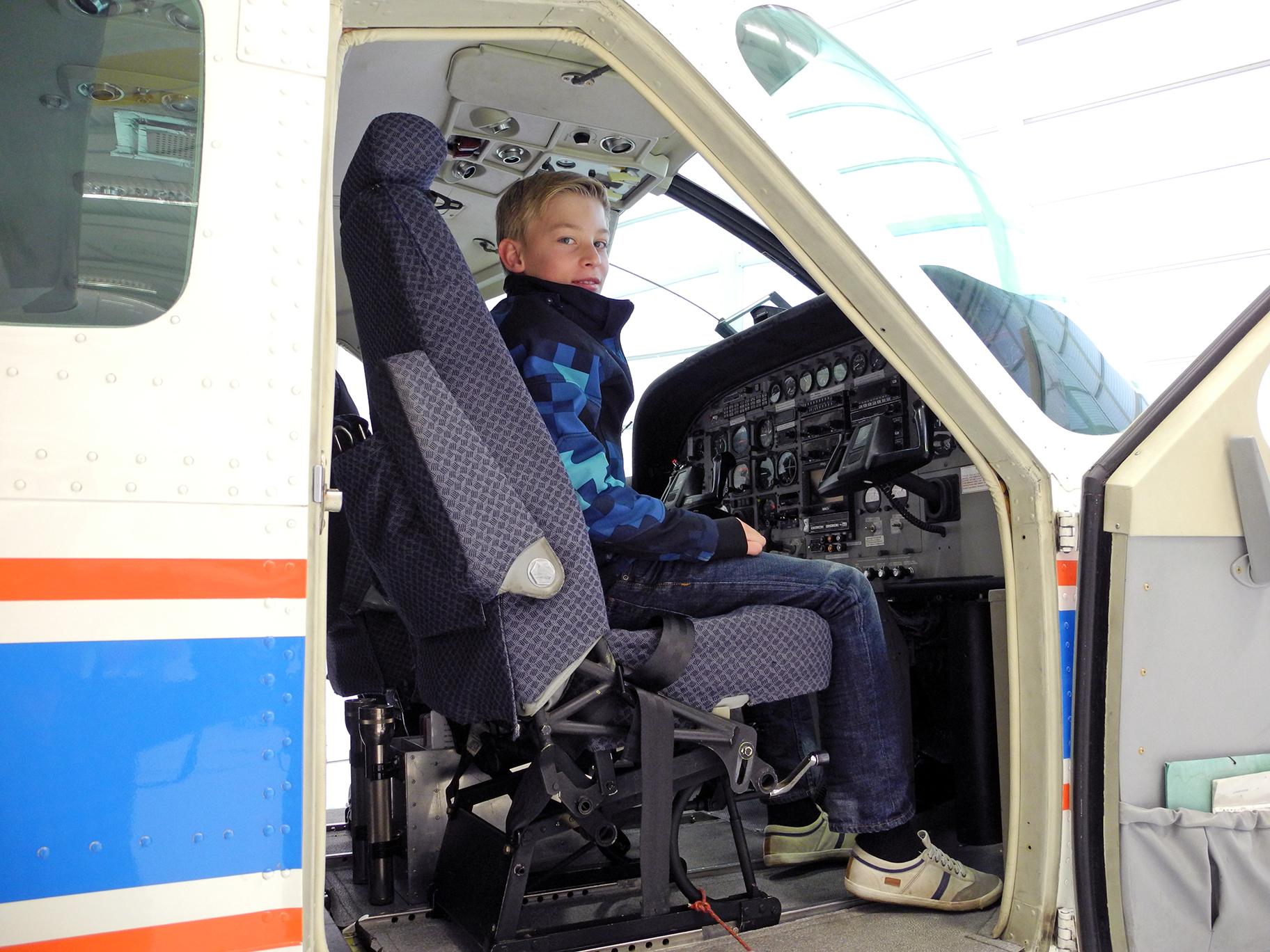 Schülerpraktikant Frederik Trautmann im Cockpit der Dornier Do 228-212 des DLR.