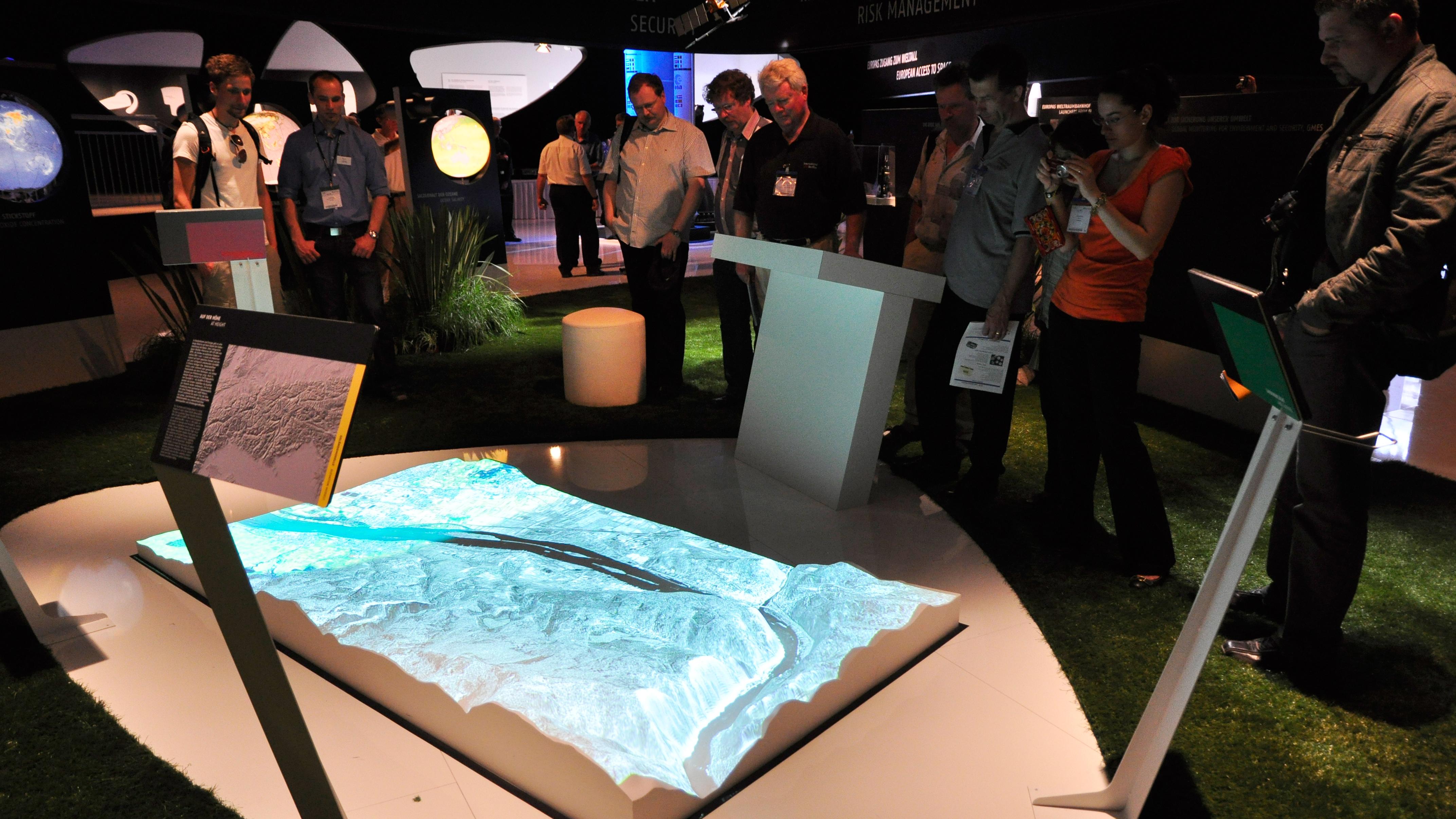 Anhand eines dreidimensionalen Reliefs des Mittelrheintales können die Besucher des Tags der offenen Tür im Bundesministerium für Wirtschaft und Technologie am 24. und 25. August 2013 den Nutzen der deutschen Erdbeobachtungsmission TanDEM-X erfahren. Die unterschiedlichen Farben verdeutlichen die unterschiedlichen Höhen des Geländemodells. Das Bild ist auf der Internationalen Luft- und Raumfahrtausstellung ILA 2010 entstanden.