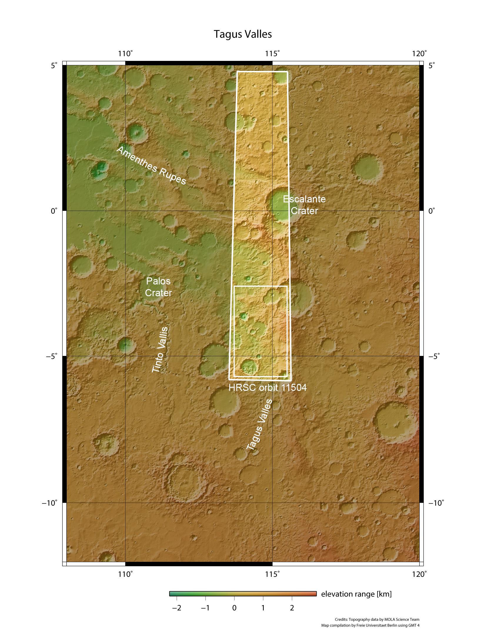 Die Tagus Valles entspringen im Norden der Hesperia-Ebene im Marshochland. Die Ausläufer des kleinen Tals erstrecken sich bis in eine sehr alte, stark von erodierten Kratern gekennzeichnete Region, die vom Kamerasystem HRSC auf der ESA-Sonde Mars Express während des Orbits 11504 am 15. Januar 2013 aufgenommen wurde. Die hier vorgestellten Szenen befinden sich in dem rechteckigen Ausschnitt im unteren Drittel des HRSC-Aufnahmestreifens.