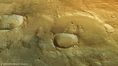 Die Umrisse des etwa 30 Kilometer großen Kraters in der rechten Bildhälfte sind kaum noch zu erkennen, die Erosion hat seine einst mehrere tausend Meter hohen Ränder im Laufe der Jahrmilliarden bereits stark abgetragen. Das Innere des Kraters ist von einer ebenen Schicht aus Sedimenten verfüllt, die vermutlich zum Teil von einem Fluss ins Innere des Kraters verfrachtet und dort abgelagert wurden, dessen Taleinschnitt im rechten Bildhintergrund noch zu erkennen ist. Der kleinere Krater in der Bildmitte ist wesentlich jünger, da er den Rand des größeren Kraters schneidet und auch noch wesentlich schärfere Umrisse hat als dieser.
